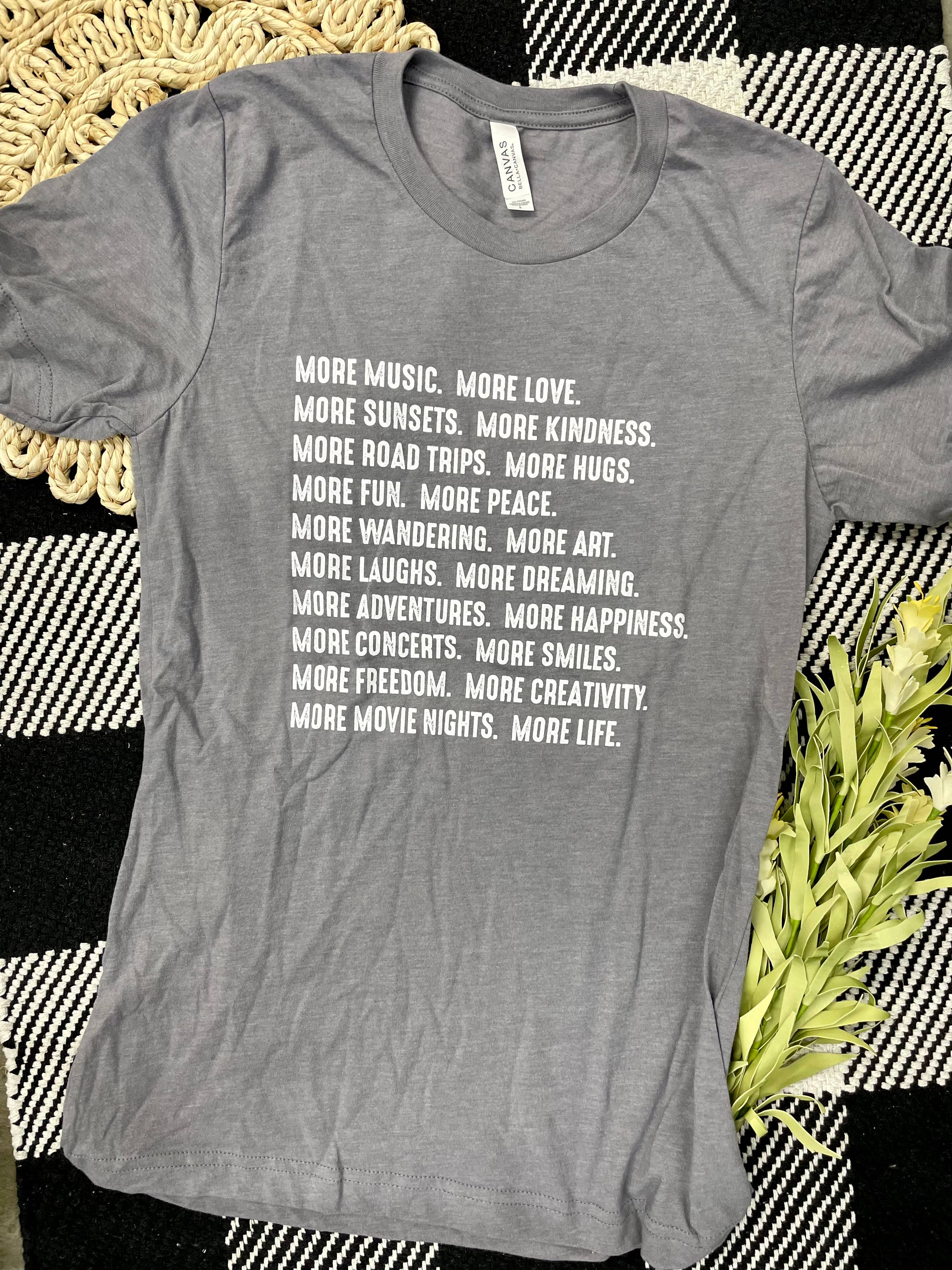 This woodcut 'Manifesto' is part of Soul Flower's bigger manifesto on how we collectively view life and work. Kick off those shoes, be a positive force, and be the change you want to see in the world. T-shirt reads: be yourself ~ spread positive vibes ~ get lost in the music ~ take dance breaks ~ run around barefoot ~ wear what you love ~ make your heart sing ~ practice kindness ~ believe in each other ~ find your tribe ~ fly your freak flag ~ let your soulflower (Read our full manifesto here). Relaxed fit, for a more fitted look size down. Made in the USA. 50% organic cotton, 50% recycled plastic (from recycled beverage bottles). Eco Gray.