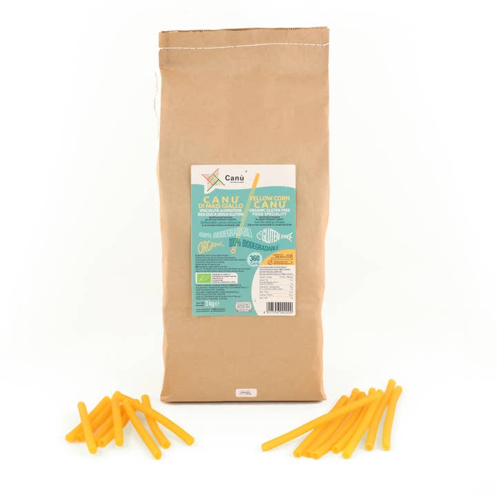 Canù is the first organic and gluten-free pasta straw, so it can also be used by those who are intolerant or allergic to gluten and made with only organic white corn flour and Nerone rice. It lasts more than an hour inside a drink and does not alter its flavor or color. It gives a touch of design to the cocktail, contributing to the protection of the environment. Canù is a disposable and 100% biodegradable straw, a perfect alternative to plastic. It is not recommended to use it with hot drinks. - A 3 kg bag contains about 500 short canù (13 cm) or 360 long canù (17 cm) - Ingredients: organic white corn flour (90%) and Nerone Organic rice flour (10%)