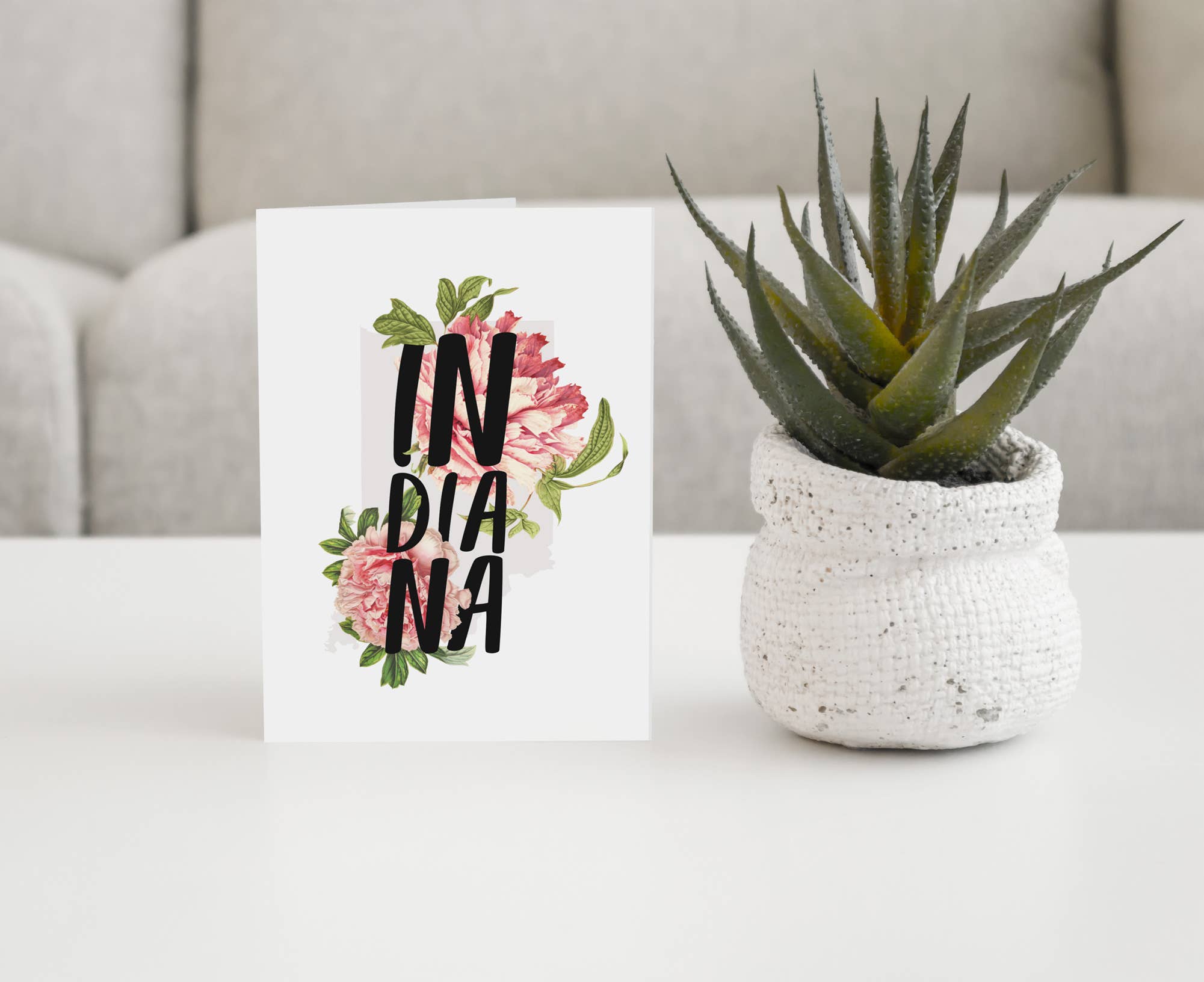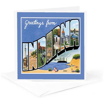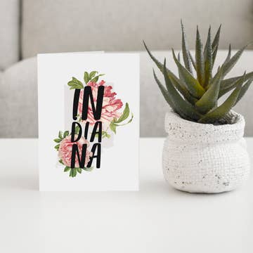 A2 (4.25” x 5.5”). Flat printed in Birmingham, Alabama on 120 lb. uncoated paper. Packaged in a cello sleeve with a coordinating envelope. Blank inside.