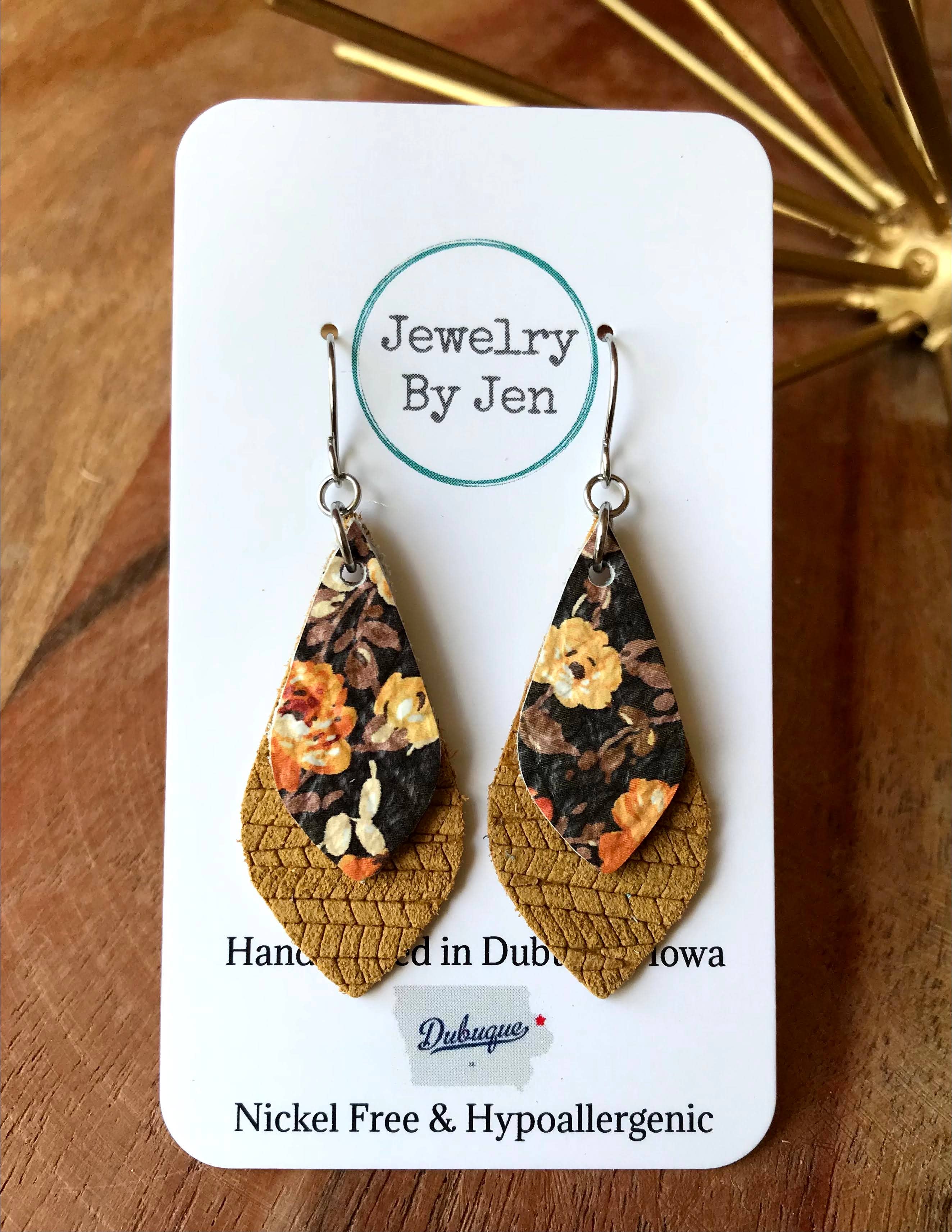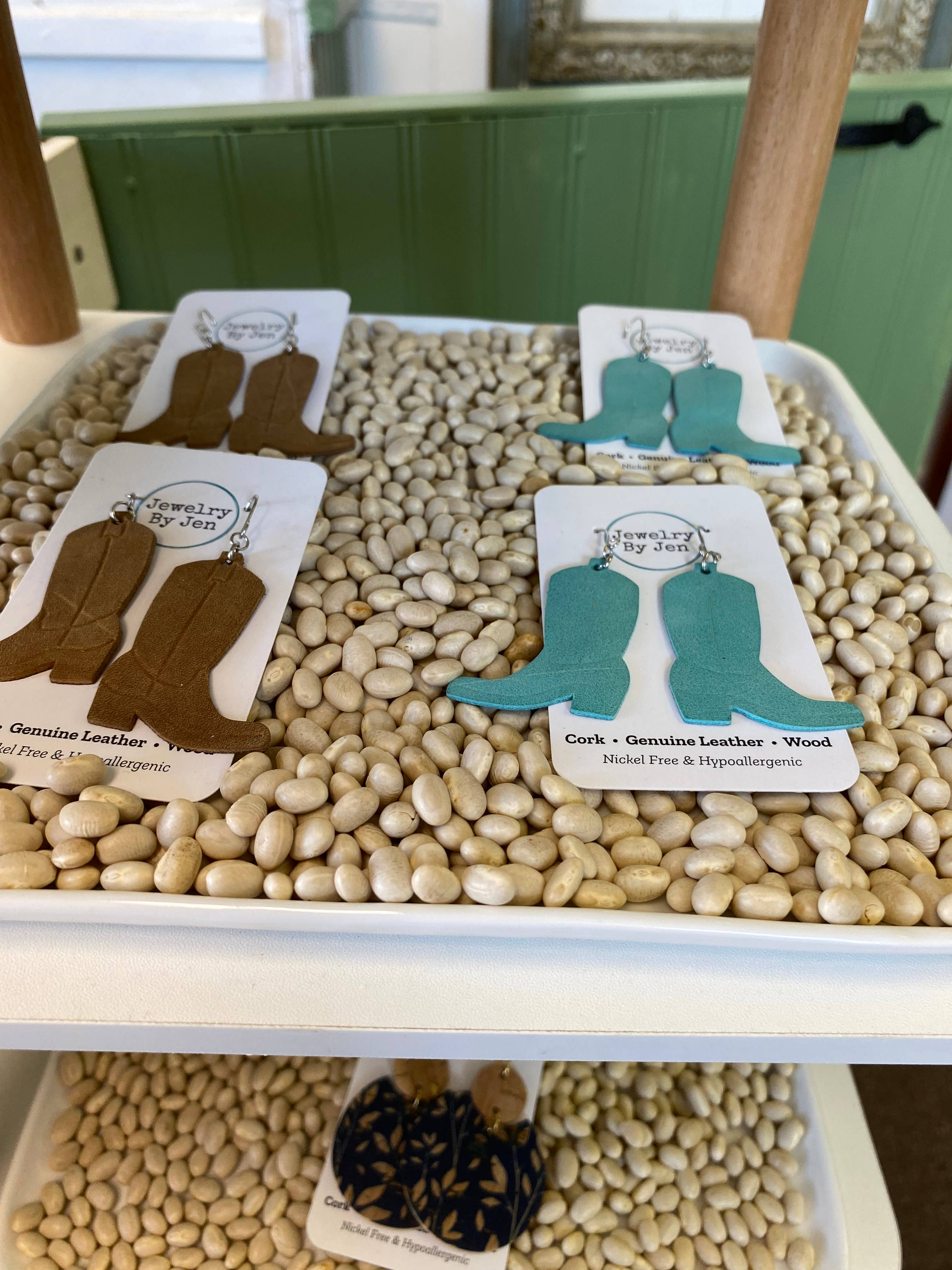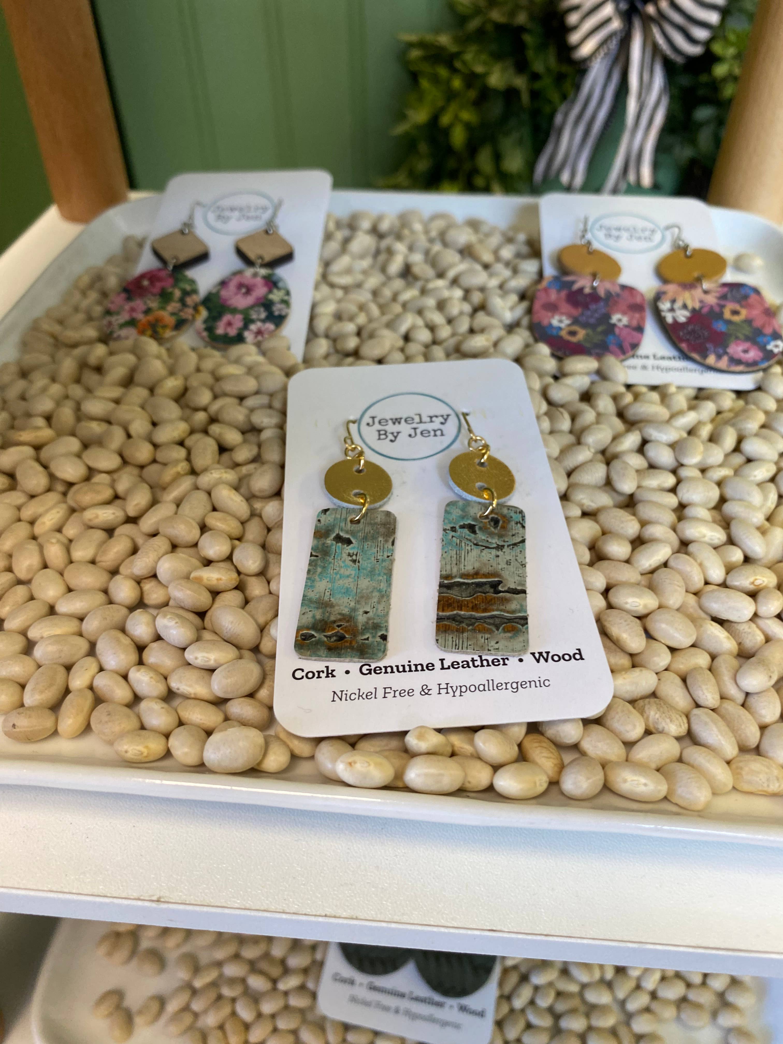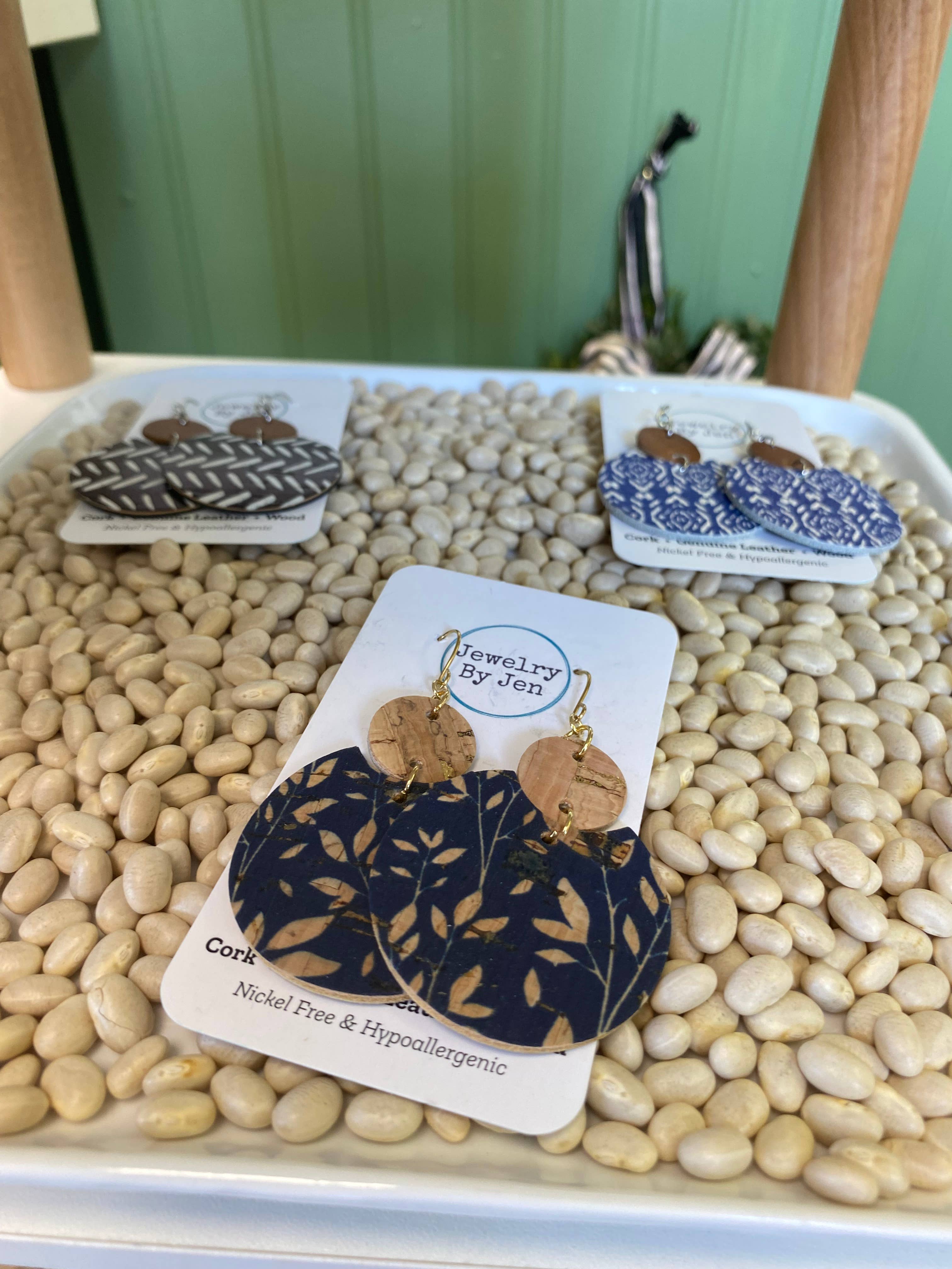 Medium size earring measuring 1”x1 3/4”. Stainless steel hook. Cork Bonded to Genuine leather. Please Note: Natural imperfections are the nature of cork. It is inherent to its surface and adds to the aesthetic. No two areas may be the exact same and will have naturally occurring marks or colorings related to cork.