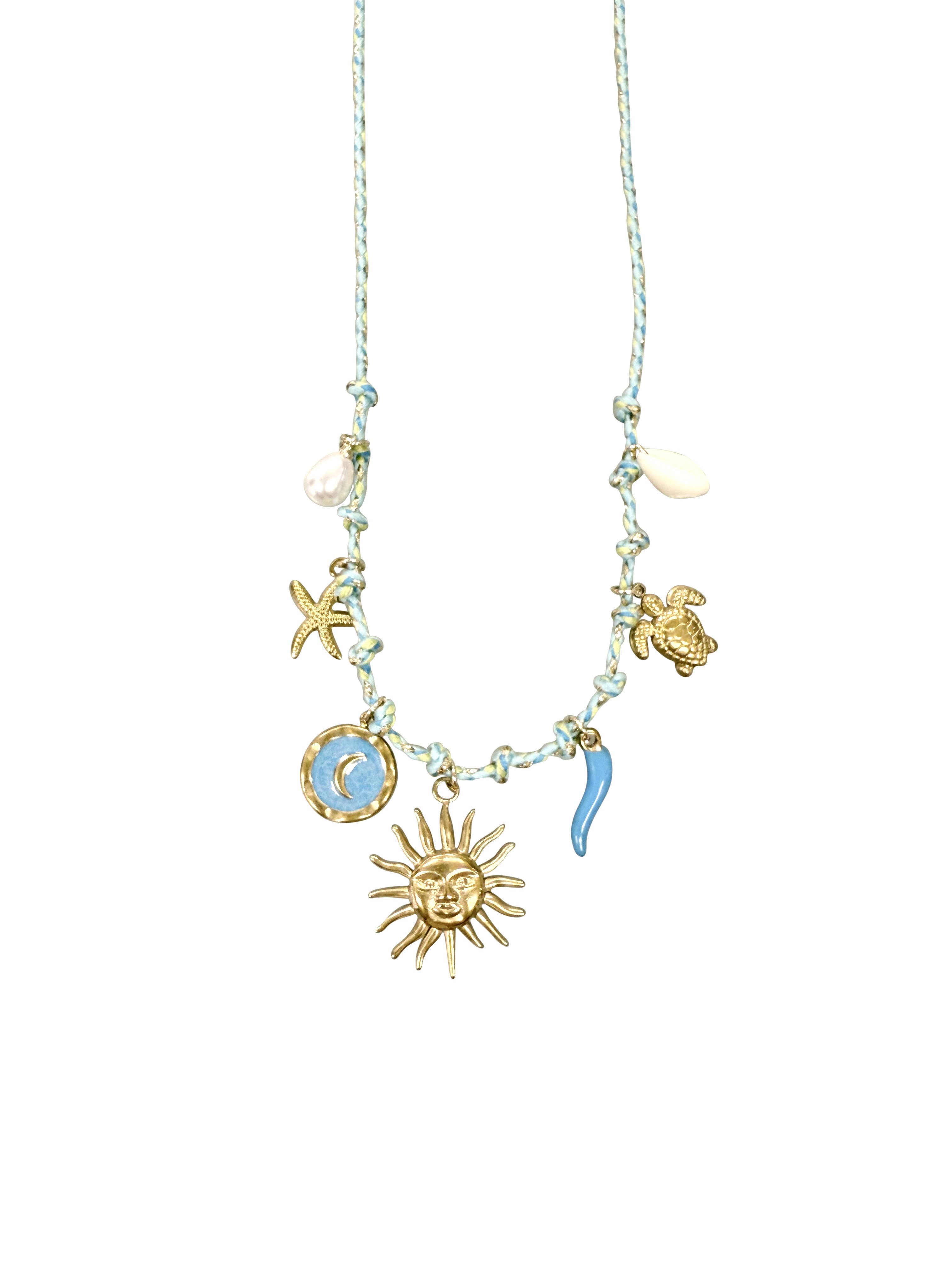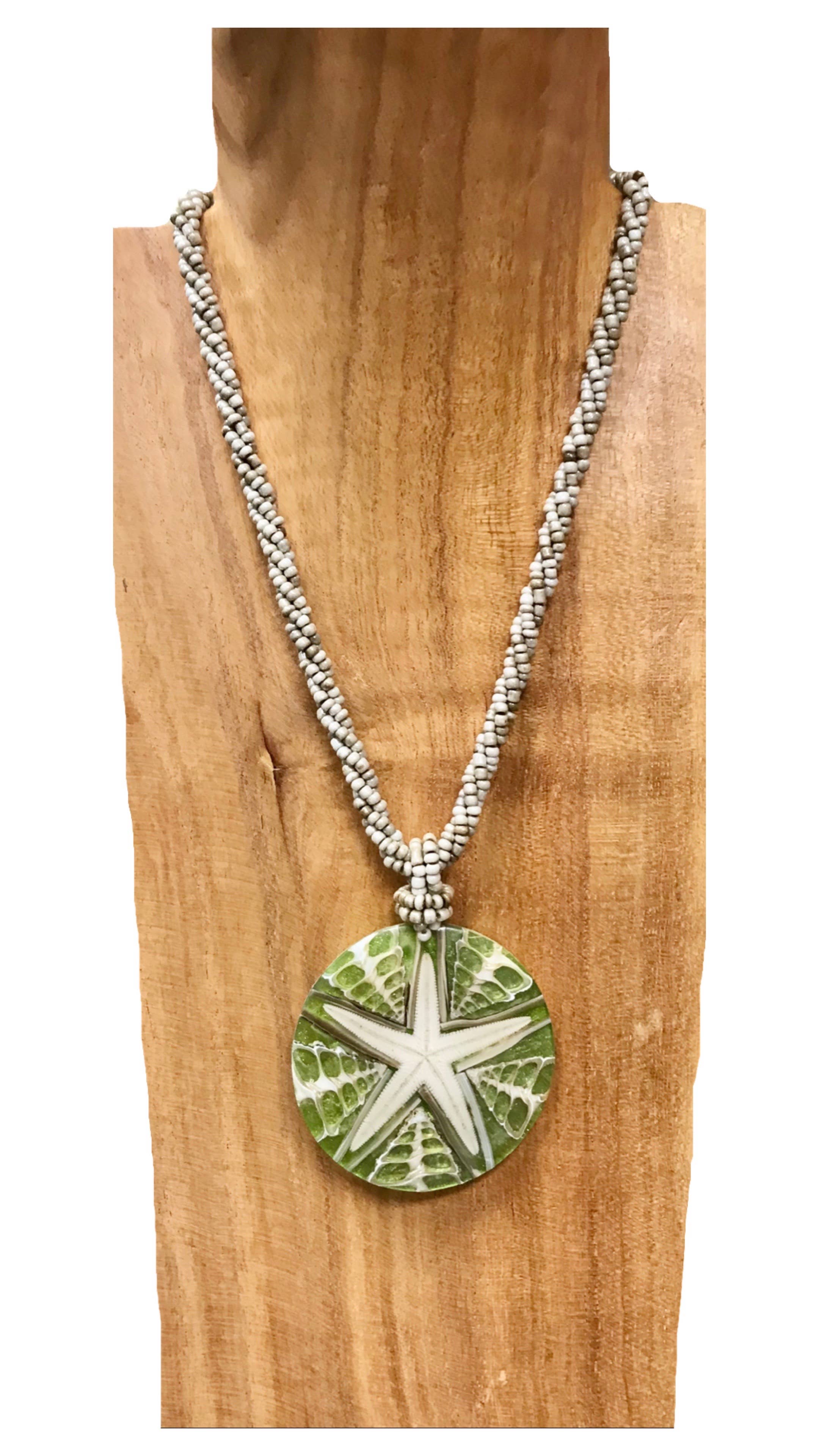 Genuine Sand and Dianthus with cast starfish set in Resin. Setting is cast in pewter and sterling silver plated. 5/8" diameter. Chain is 16" plus 2" extension. Blue Quartz faceted stone.
