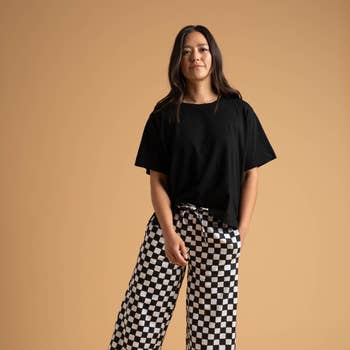Demi Checkered Bottoms w Elastic Band -High-waist -Straight fit -Front patch pocket -Gingham print SPEC Waist 12 5/8 Inseam 29 1/2 100%Cotton Model's height is 5' 7" and wearing a size S