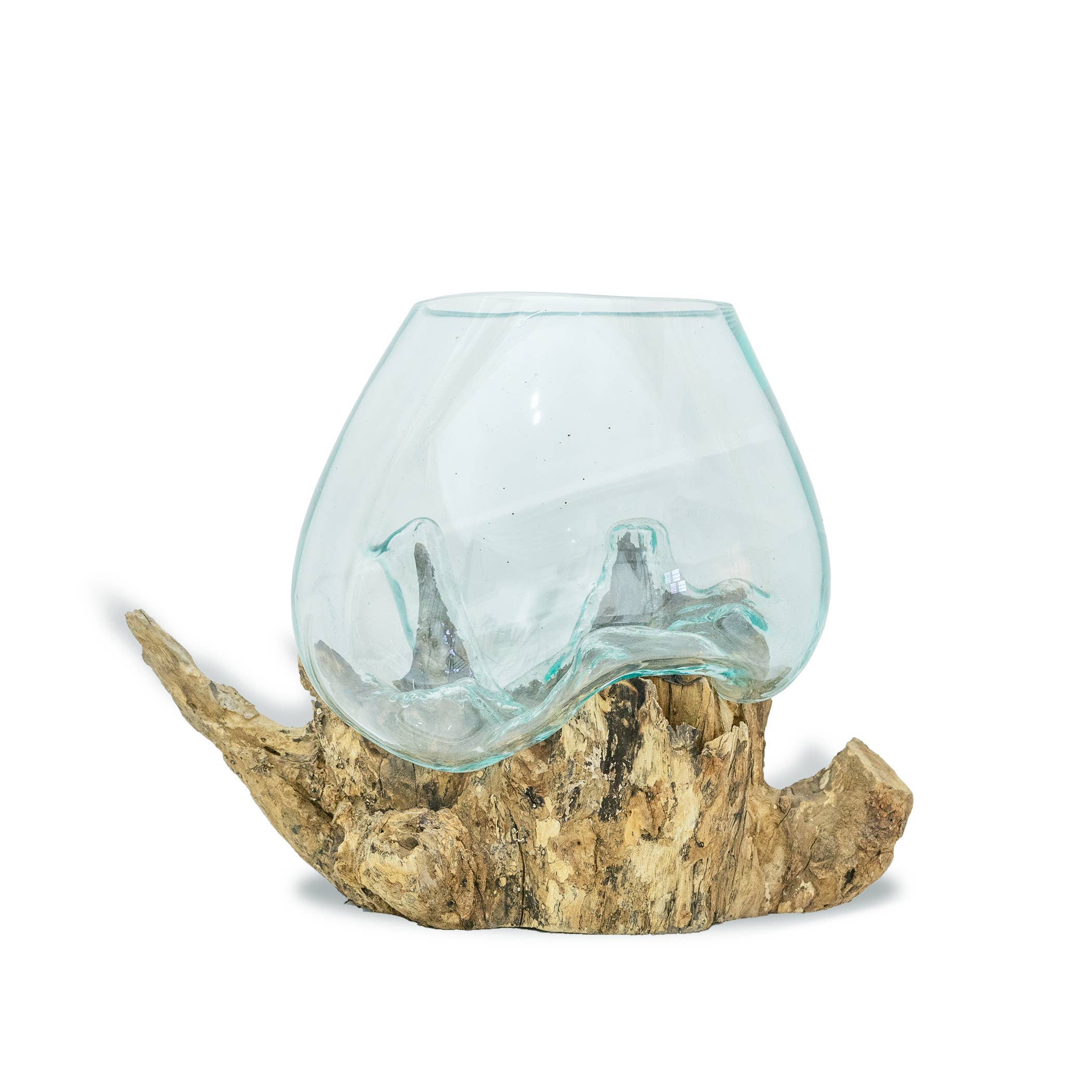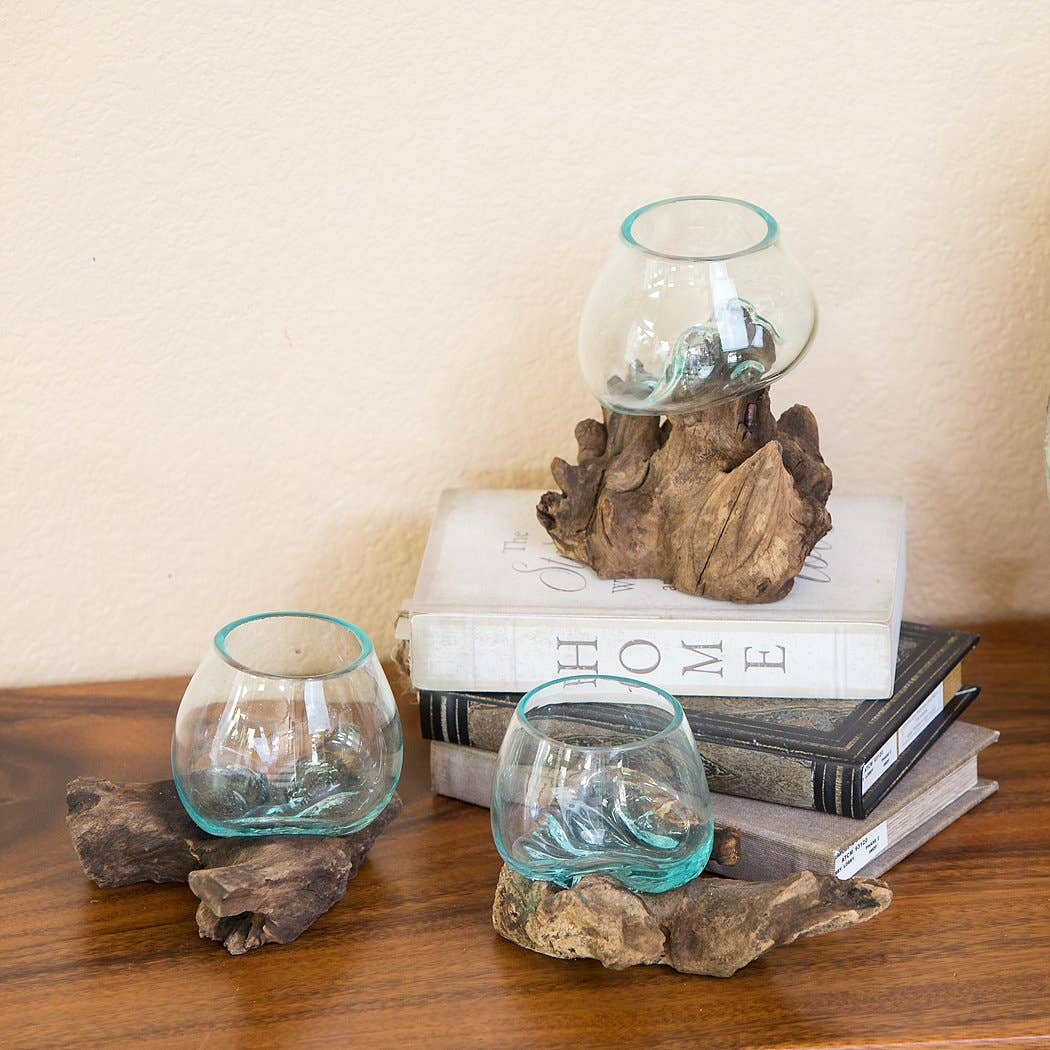 Skilled artisans in Bali, Indonesia use recycled glass to hand blow this beautiful one of a kind glass vessel directly on top of Gamal root bases. This wood otherwise scraps from the hardwood furniture industry. As a result of the organic nature of the product, there are no two exactly the same. Some have larger wood, some have a larger glass. Slight imperfections in the glass are a result of the primitive hand-blown nature of the product. Because Cohasset works directly with the Balinese artisans who craft this product, our quality is top-notch. Not all sellers of these products have the same quality standards.