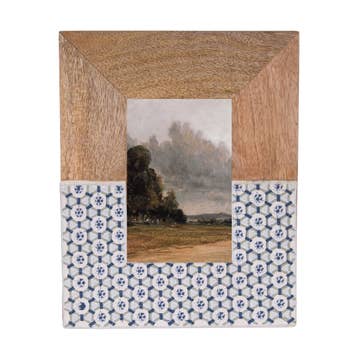 Our river inspired Kaveri Collection incorporates traditional Indian art forms in modern designs, featuring sustainably harvested mango wood, ethically sourced bone, and brass inlay. Master artisans in Old Delhi skillfully hand carve wood and bone elements to create unique, eye catching inlay designs. This handcrafted photo frame is thoughtfully designed for stylish display of a 5x7 photo or print, featuring a multi-tone, clean line design expertly crafted from mango wood, bone and brass. The picture frame features a two-way table top easel and d-rings for hanging. Dimensions: Overall 7.5"W, 9.5"L; Photo opening 5"W, 7"L Bone used is cruelty-free, collected from naturally deceased animals and repurposed to make one-of-a-kind pieces for the home. *Please note: slight variations may occur due to the use of natural materials and are considered part of the product's unique, hand-crafted charm.