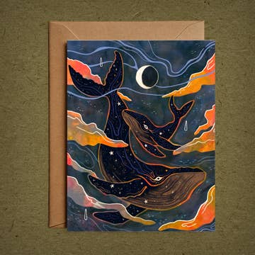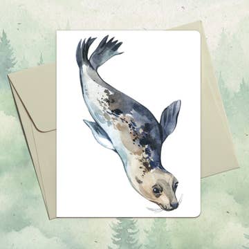 A hand-painted card featuring mermaids swirling in a kelp and seaweed forest. Fun, charming, and sweet! Crafted with care on 100% Post-Consumer Waste, FSC-certified stock in a solar/wind-powered facility, and printed with vegetable and algae inks, our cards are an earth-friendly choice for retailers. Each card features a blank interior and includes a Kraft envelope, providing a lovely canvas for your customers' good wishes, thoughtful notes, and sweet sentiments. Details: - A2 (4.25” x 5.5”) - Kraft envelope included - Blank inside - Printed with vegetable and algae inks - Produced locally in a solar/wind powered facility - Printed on 100% Post-Consumer Waste, FSC-certified stock