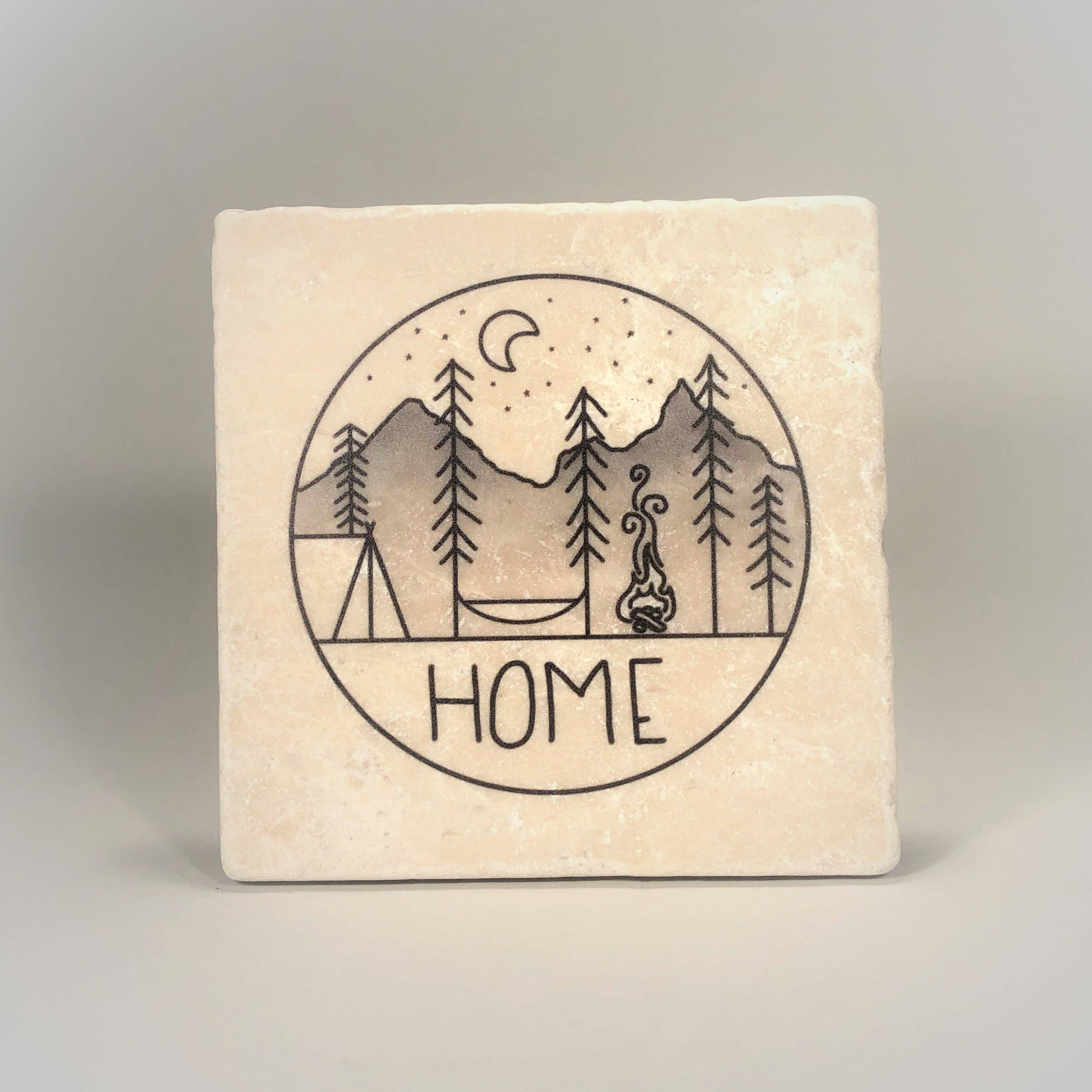 Made in the USA! Mountains Are Calling Nighttime Badge Coaster Check out our entire graphics line for plenty more products to get you into the drinking spirit. :) You can choose between 3 body types: Ceramic, Stone, or Wood. Ceramic has a satin finish with a cork backing. Dimensions: 4.25" x 4.25" Stone has a matte finish with a cork backing. Dimensions: 3 15/16" x 3 15/16" Wood has a satin finish with a magnet backing which can be used as a coaster or a magnet. Dimensions: 3.5" x 3.5"