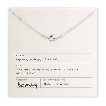 "The best thing to hold onto in life is each other." -Audrey Hepburn Charms: Knot Charm size: 6mm Length: 16" fine cable chain Available metals: Sterling silver Packaging: Message necklace card + jewelry box