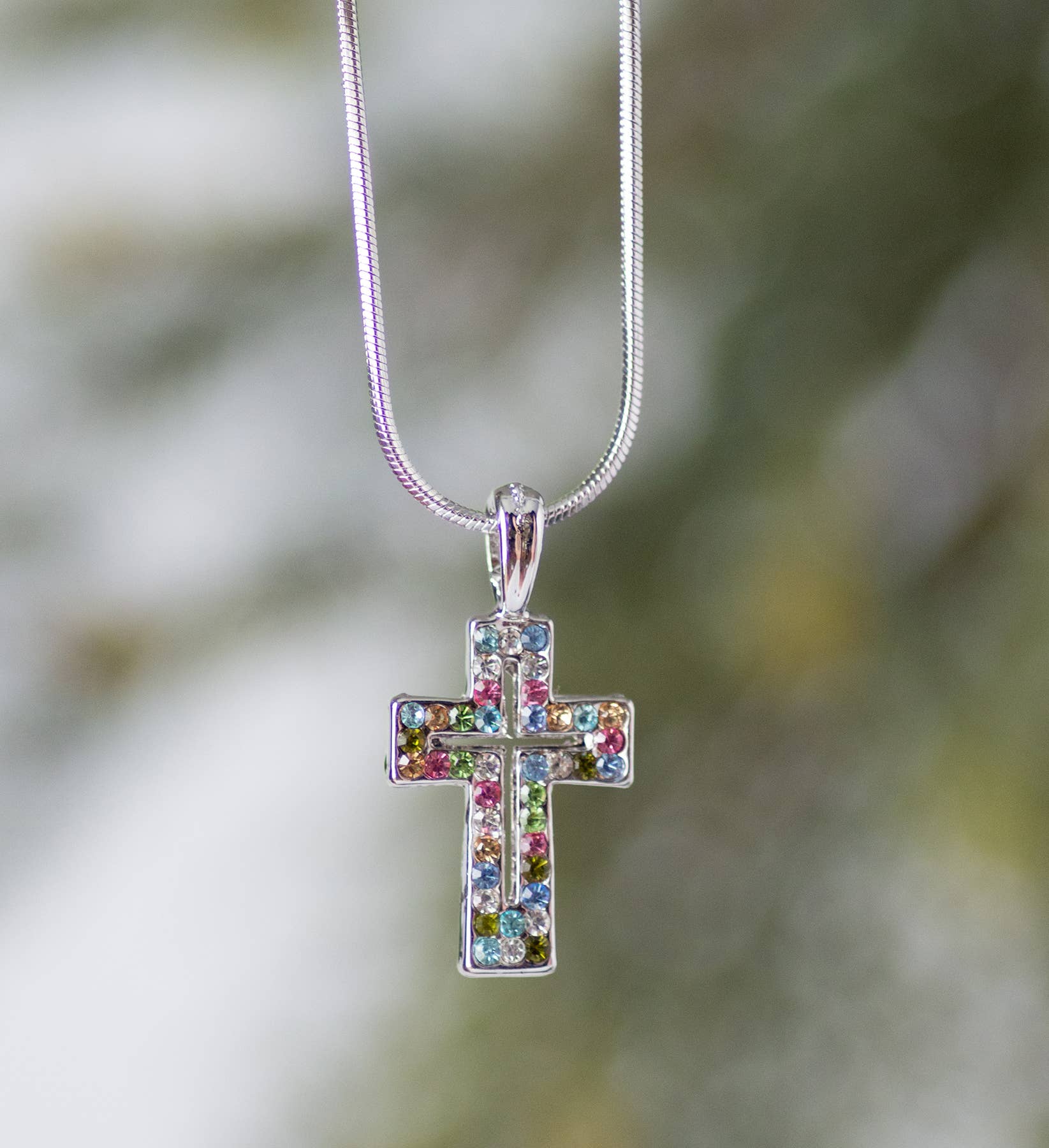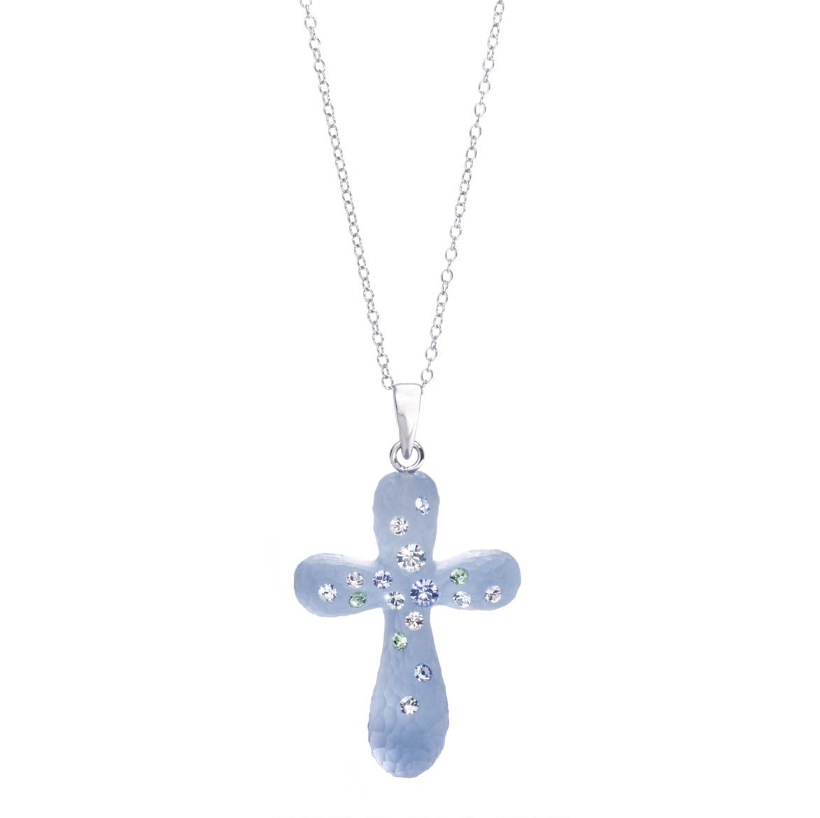 This handcrafted lucite necklace is embellished with colorful Swarovski Crystals. The pendant includes an 18" sterling silver chain. The cross is about 1.25"