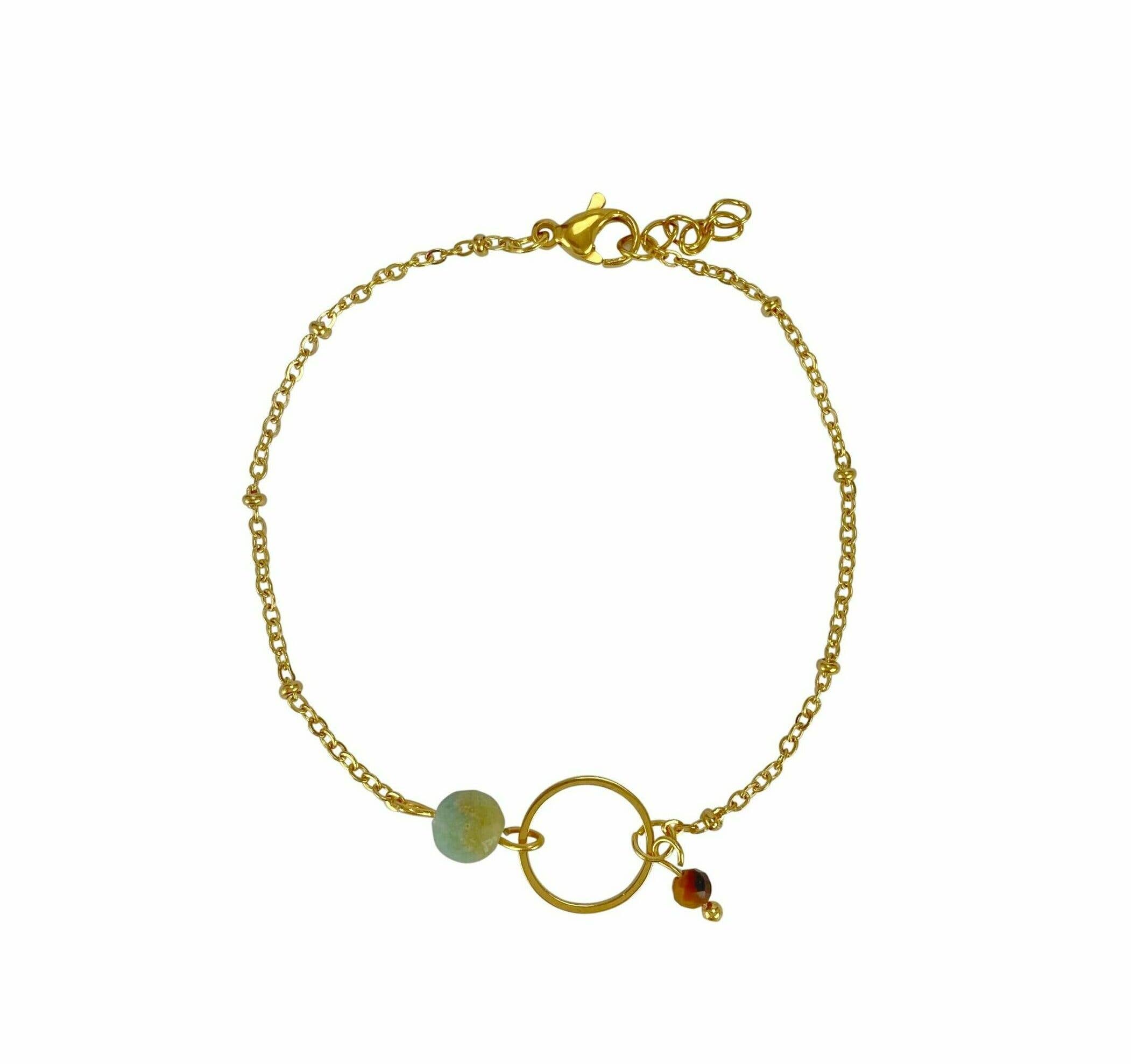 Aquamarine, Sapphire & Pearl Bracelet, made of stainless steel. The bracelet is made in our own workshop and is durable, strong, hypoallergenic and colorfast. The ring on the bracelet has a nice twisted effect. The gemstones are faceted and sparkle beautifully. Aquamarine: calming - spiritual growth - high sensitivity or high sensitivity - cooling - hormonal system balance - sharp and focused Sapphire: love — truth — pure — mental peace — success Pearl: stimulates purification - acceptance - rest - peace - protection - emotional balance - hormonal balance The Aquamarine, Sapphire & Pearl Bracelet has something classic, adding a romantic touch to your outfit. Bracelet length: 17.5 cm + 2 cm extra length Twisted ring size: 1.6 cm