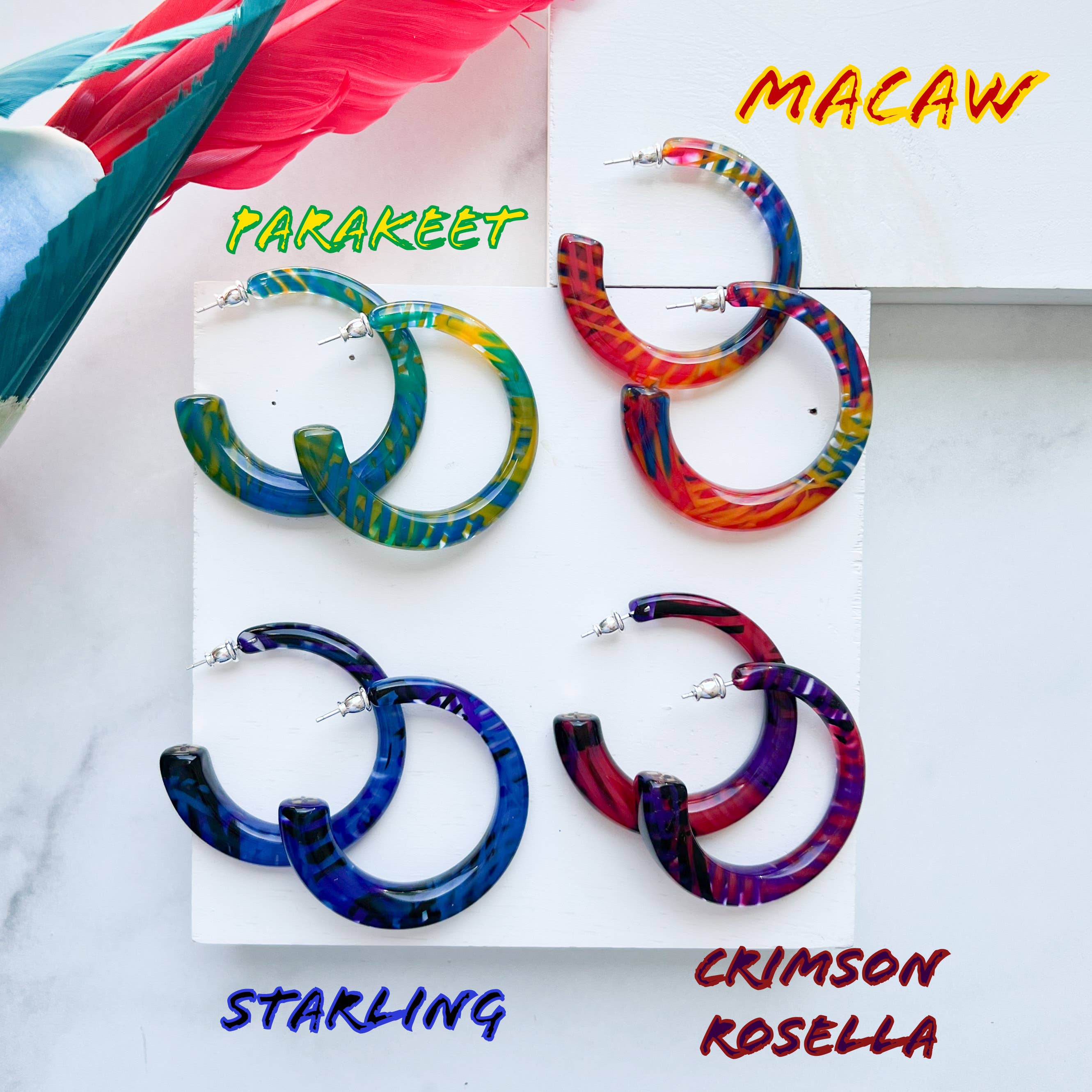 size 15mm 925 silver posts Italian acetate All of our pieces are made from cellulose acetate. A mixture of cotton pulp and acetic acid. It is a biodegradable and eco-friendly material. Acetate is lightweight yet durable. Our acetate is sourced from Italy and Japan and then manufactured and finished in both China and Idaho. We are a small, Woman-Owned business located in Boise.
