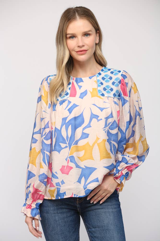 Abstract printed top with a smocked detail. Featuring a puff sleeve and a back buttoned keyhole. Model Size + Fit: Model height: 5'9" Dress size: Small Bust: 33 Waist: 25 Hips: 34