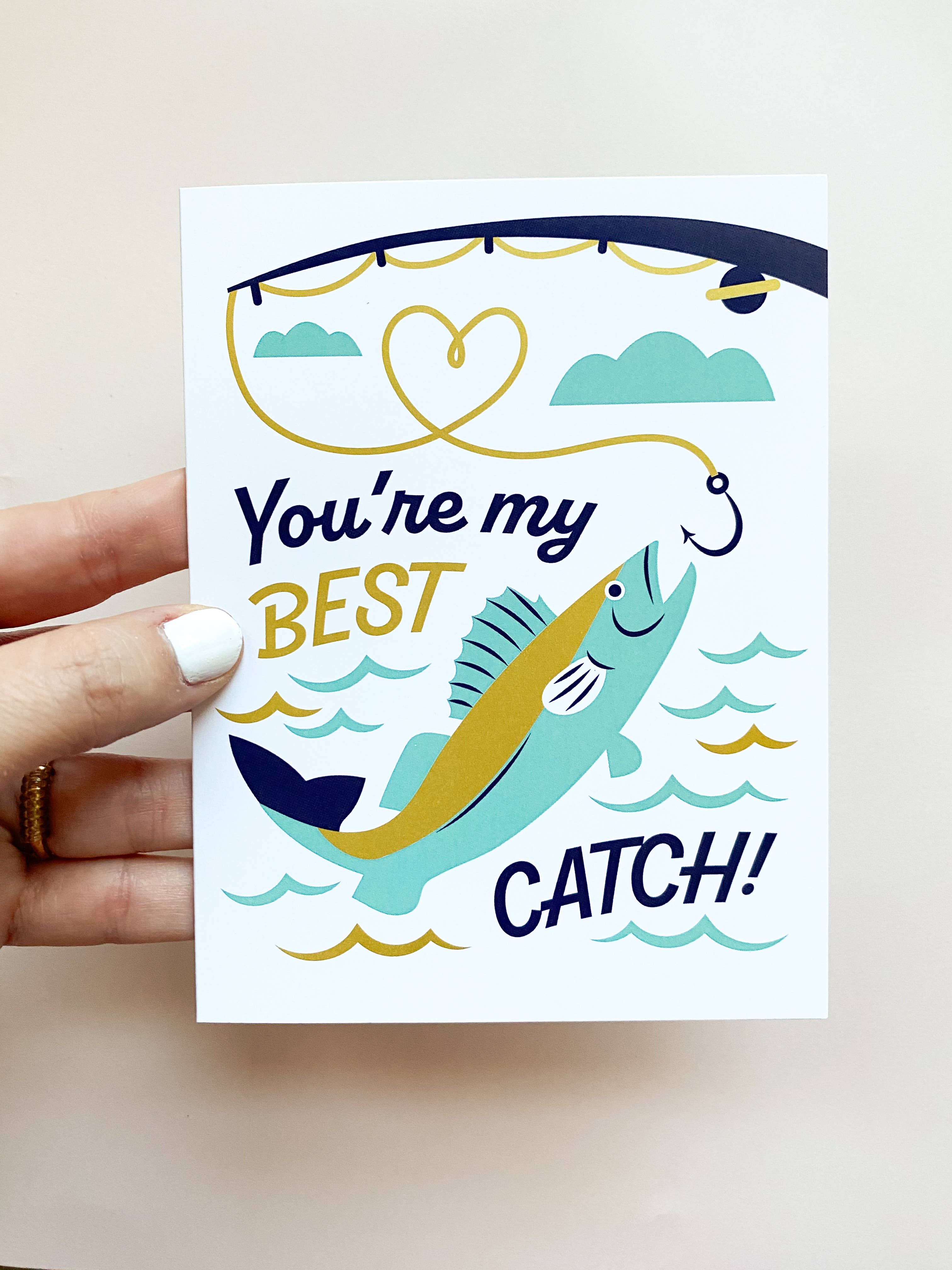 Nothing fishy here, send a cute card to your best fin in the world! {size} - A2 {paper} - Printed on Crane Lettra 110 lb. paper {color} - yellow, blue and black inks {envelope} - A2 yellow envelope {packaging} - Individually wrapped in a cellophane sleeve All cards are blank inside. As this is letterpress printed, each card is unique. All designs © 2010-2025 Kiss and Punch, LLC by Julie Stewart. All rights reserved.