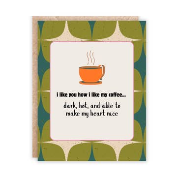 A perfect heart in a warm cup, sure to delight coffee-lovers everywhere. Originally drawn on a sunny October day, at Speicherstadt Koffee in Hamburg, Germany. - A2 size (4-1/4"x 5-1/2" when folded) - Blank inside - Offset printed in Toronto on natural-white, heavyweight, textured paper - Die-cut with rounded corners - Matching envelope included SKU: 1312