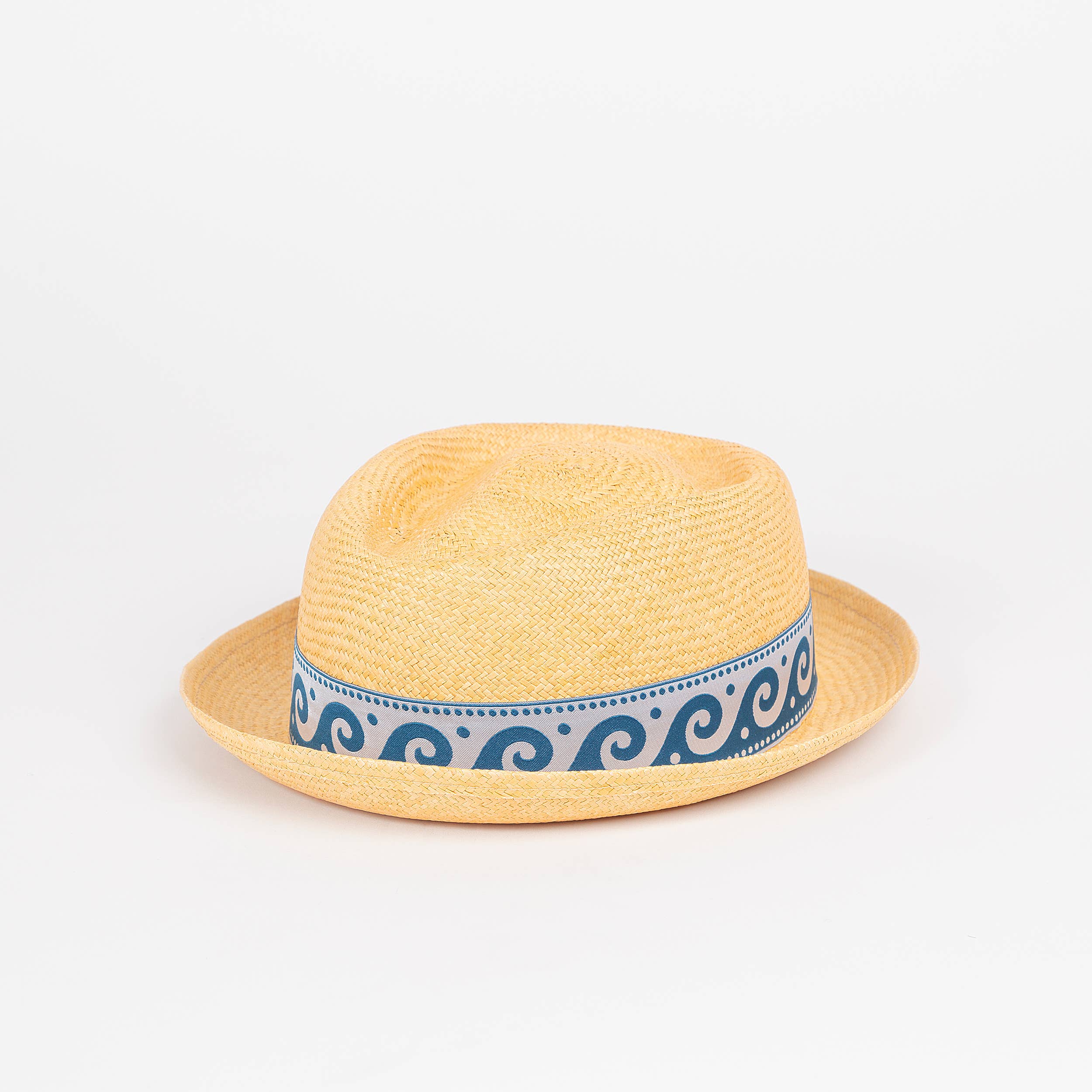 A fresh, light summer hat featuring Elegancia Tropical's exclusive ocean-inspired hat band. Whether you are at the beach or just wish you were, the Olas hat will lighten your step and turn heads. -Handwoven for 8 hours by expert artisans with everlasting toquilla straw -Grade 4-5 -Color: Light Blue -Brim size - 2-3/4” (7cm) -Crown size - 4-3/8” (11cm) -UPF 50+ -Features a sweatband made of 100% cotton -Features a fine hat band made of polyester and cotton -Sustainably sourced and produced