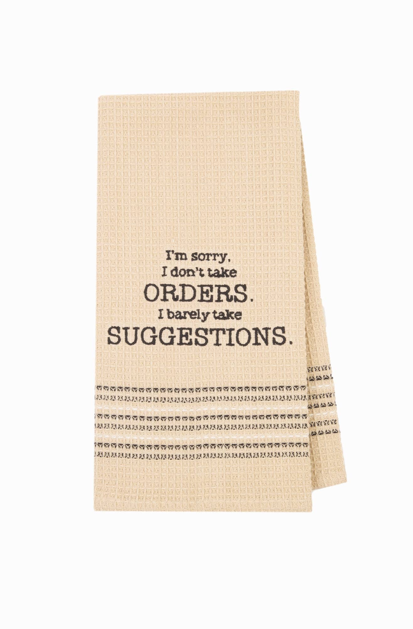 "How About a Big Bowl of I Don't Give a Fuck?" Funny Kitchen Towel * Carded with UPC code, care instructions, and hang hook for retail display * Towel size: 18" x 28" * 100% cotton tea towel with funny saying * Text: “How About a Big Bowl of I Don’t Give a Fuck?” * Black and white design with matching border * Soft, absorbent, and machine washable * Includes 2 hanging loops for home use * Ideal for novelty, kitchen, and gift retailers * Hey Now™ branding Item # HT0001