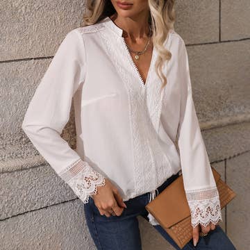 solid color splicing lace ruffle hem long sleeve shirt style: casual type: regular material: polyester neckline: v-neck sleeve style: long sleeve length: regular pattern type: plain decoration: ruffle hem fit type: regular with belt: no occasion: daily