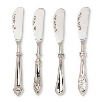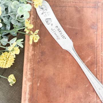 you can spread all sorts of things with these knives perfect for the new charcuterie craze ! (add a silver plate butter dish or any vintage bowl for a wonderful hostess gift) SPREAD LOVE {other wording available or if you have something else in mind, custom knives available our knife, your words} --- you will receive a pattern of our choosing we stamp letter by letter by hand which just adds to their uniqueness & character please note these are vintage items & we consider wear to be part of their charm note: we have added many new fonts & designs to our stamp collection, so while your lettering may not look exactly like those shown, the wording will remain the same, and we are certain you will not be disappointed lots of other hand stamped vintage silverware available