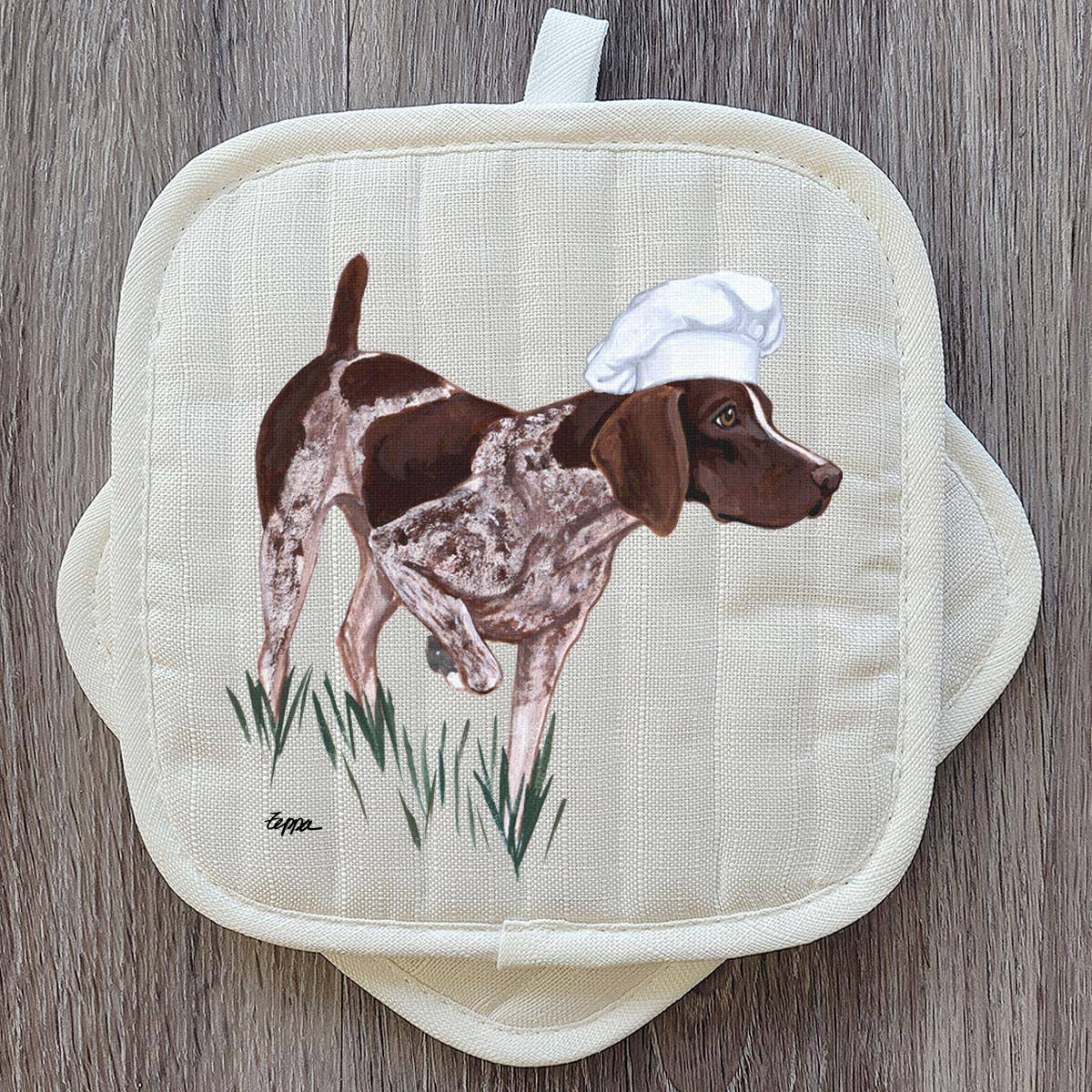 Keep yourself (or your favorite chef) clean in the kitchen or at the grill while looking doggone fabulous in a German Shorthair Pointer chef apron! Adult sized apron - one size fits most Poly/cotton linen weave fabric Adjustable neck strap Generously sized pocket with the clever saying on it Machine washable