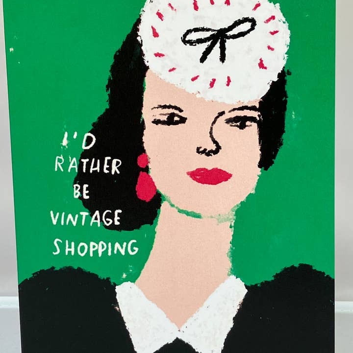 This listing is for one BLANK inside A2 sized (4.25x5.5 inch) folded greeting card and one French Paper speckletone 70lb envelope in Madero Beach. Card is flat-printed in Portland, Oregon. Paper is 120# uncoated cover white. Cardstock and Envelope are FSC-certified and contain recycled content. *Please note: The card and envelope will be packaged in a clear cello sleeve with sealed flap. (There is no longer an easy peel tab attaching the card and envelope.) The design features a vintage-inspired illustration of a fashionable lady in bright hues by Portland artist Colleen Harrington. A perfect birthday card for lovers of color, fashion, and modern art.