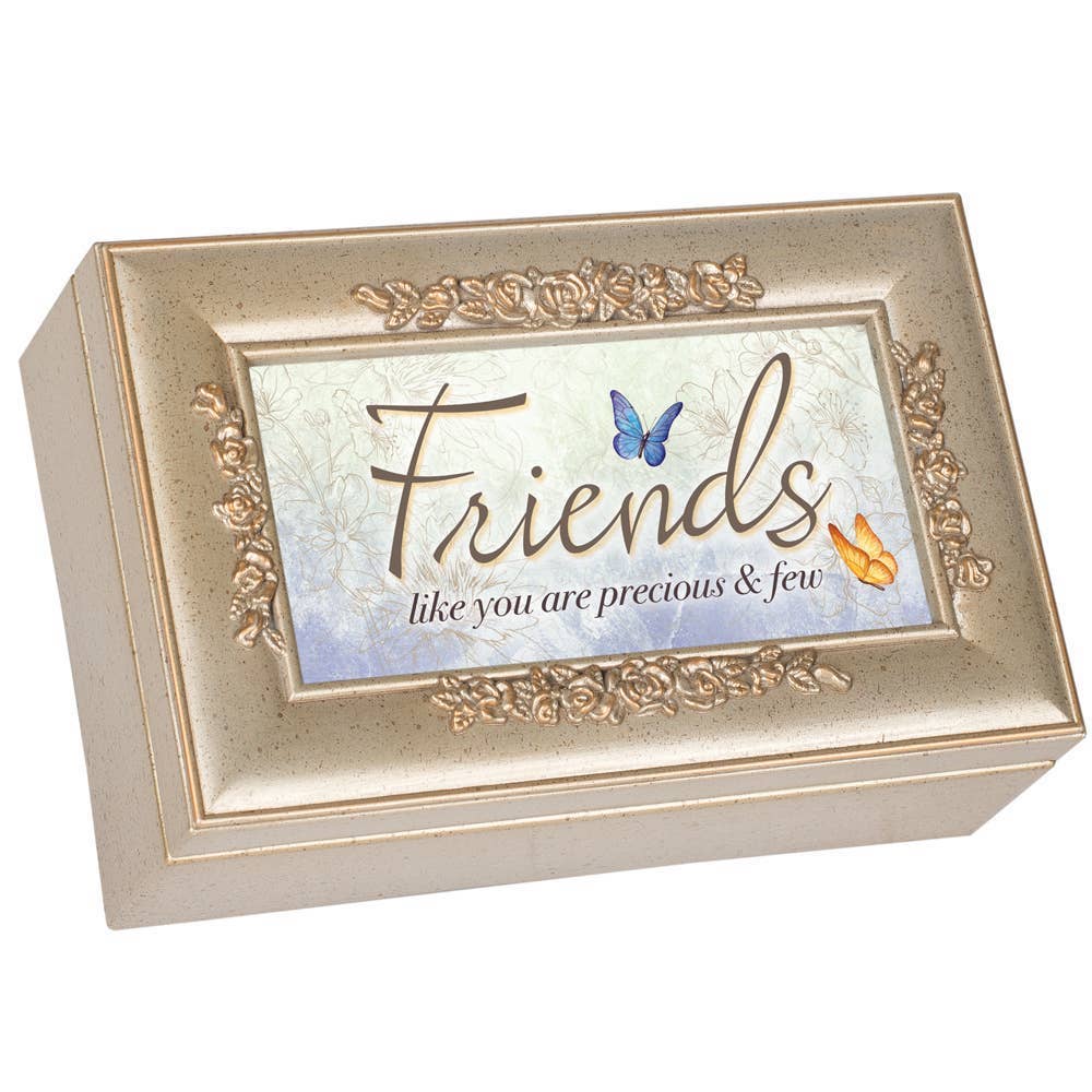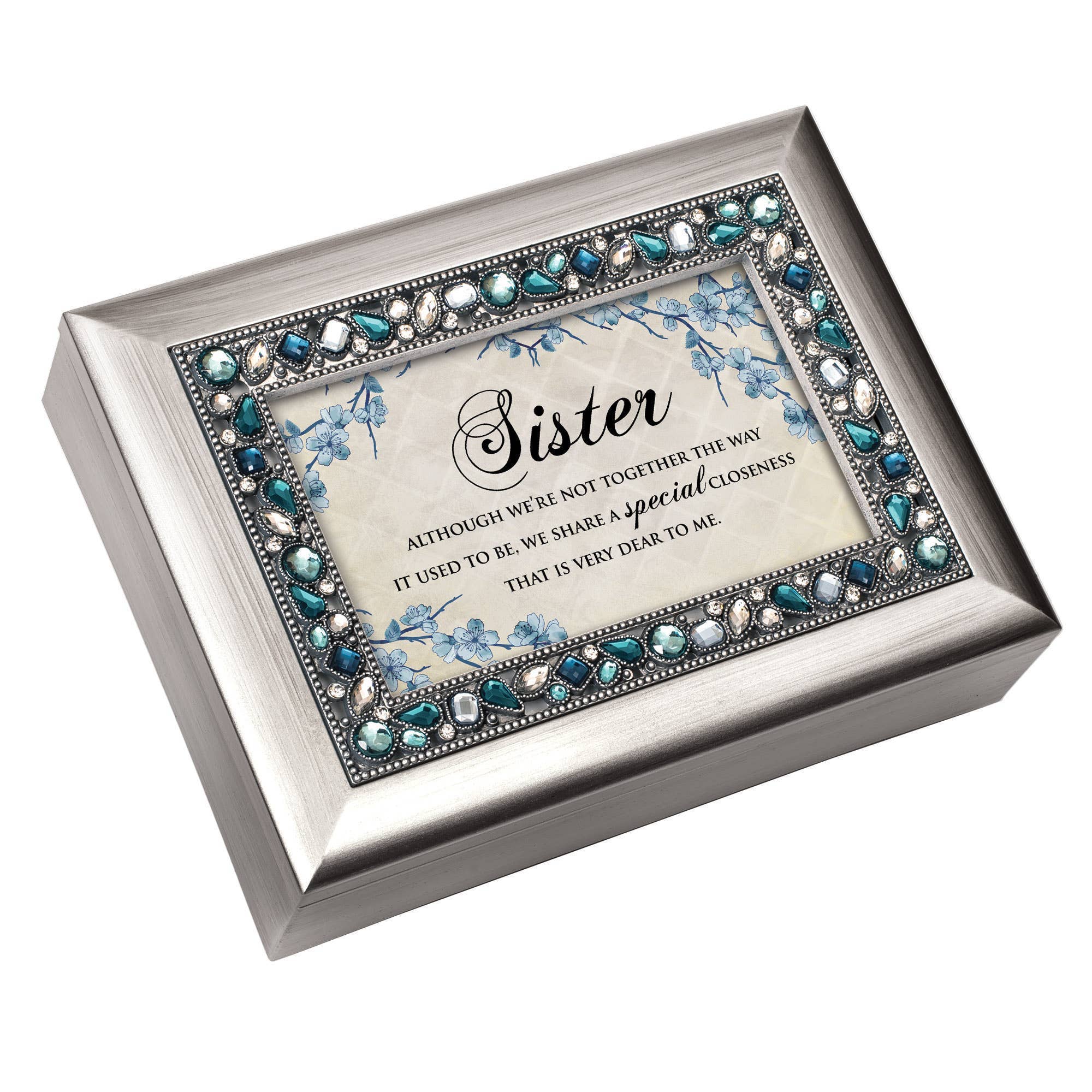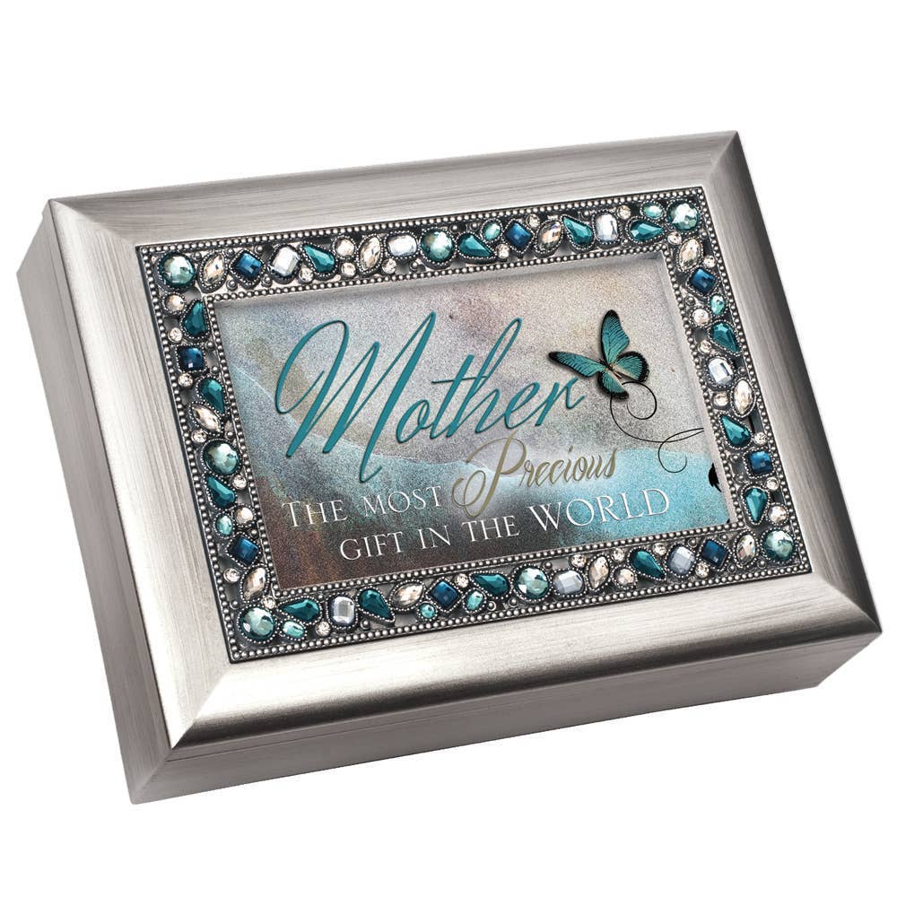 Silver Tone Jeweled Music Box in champagne silver tone finish. Beaded jewels frame the hinged lid. Jewelry box measures approximately 8 x 6 x 2.75 inches; Window opening hold 4 x 6 inch personal photo. Black velvet lined interior; Decorative bun feet are padded to protect table top and shelf surfaces. Individually boxed. Wind-up music box plays On eagle's wings.