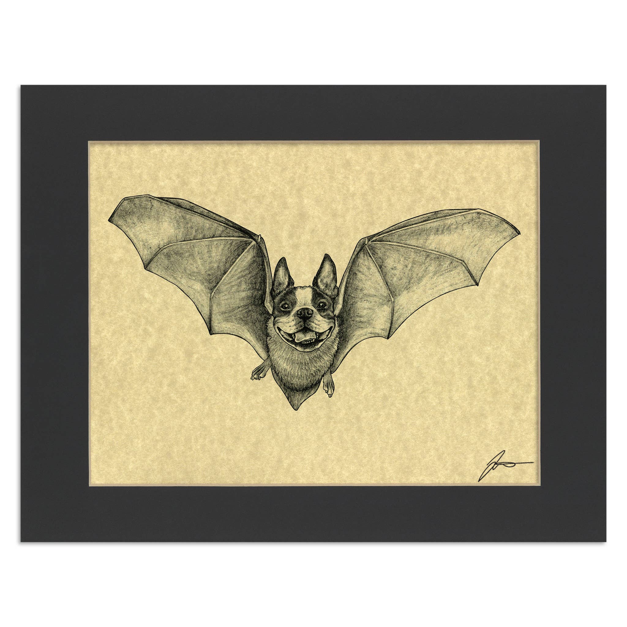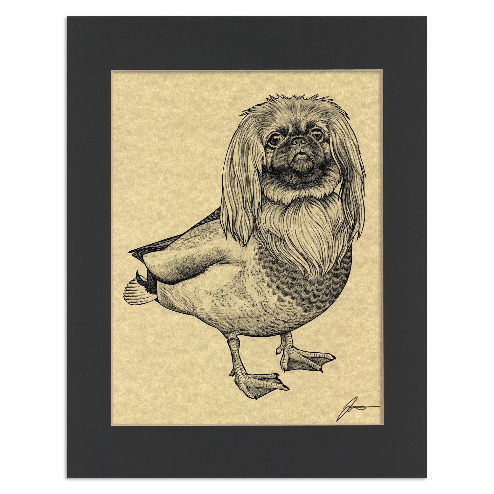 • Saber-toothed Tiger + Squirrel Hybrid Animal • 8.5x11" high-quality laser print on Astroparche® aged velum 65# cover paper • Mounted inside an 11x14" black mat • Packaged with a double thick backing board inside a protective plastic sleeve • Hand signed by the artist • Fits in any standard 11x14" frame