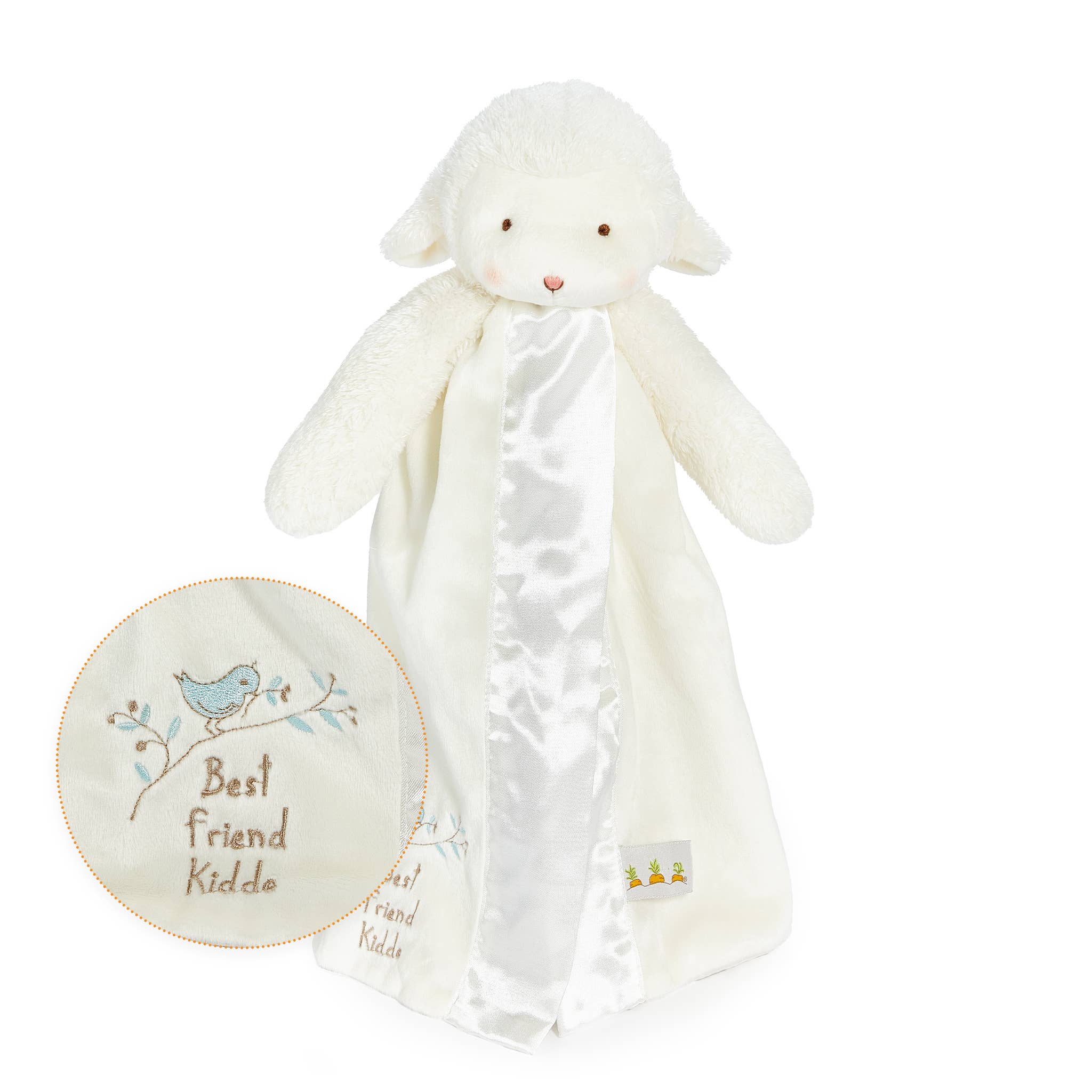 Features 16" length easy to snuggle, has satin lining Embroidered details Baby safe 100% polyester Machine wash and dry low heat Thousands of 5-Star reviews agree that our Buddy Blanket are the best lovey for your baby! The Blossom Bunny Buddy Blanket is a stuffed animal and lovey in one! The best of both, to comfort and soothe even the choosiest of babies. Blossom has a white plush floppy-eared bunny head and arms with a handcrafted, baby-safe embroidered face. The snuggly and super soft pink velour split blanket is lined and edged in silky satin for tactile development and soothing. Sure to become a best friend for your little one, the difference is in the details. From the embroidered message along the edge of the blanket that reads, Best Friends Indeed with a charming trail of carrots to our signature three carrot tag that every baby undoubtedly explores with their little fingers, our security buddy blankets are filled with thoughtful touches.