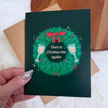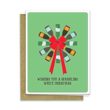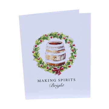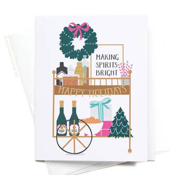 Mix up some cheer with the Christmas Liquor Bar Cart Greeting Card. A festive card for cocktail lovers and happy hour hosts. Greeting Card Details: Size: A2 (4.25" x 5.5") folded greeting card. Material: Printed on smooth white card stock paper that is thick and durable providing a premium feel to the card. Each card includes a matching white square flap envelope. Print Quality: Features vibrantly printed colors that pop, ensuring the design is eye-catching and clear. Packaging: The card and envelope are packaged in an open-top clear sleeve to protect from damage and dirt. Origin: Proudly printed in the USA and hand-assembled in our studio ensuring high-quality production.