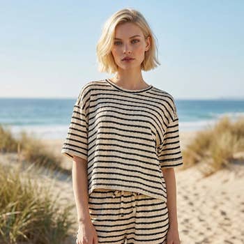 - Vertical striped short slv rugby top & shorts set - Short sleeve length - French terry material - Two tone stripe detail - White collar button down detail - Loose fit - Cropped length - Striped shorts with elsatic waistband - Front side pockets - Good stretch - Model size 5' 8" ( Wearing S size)