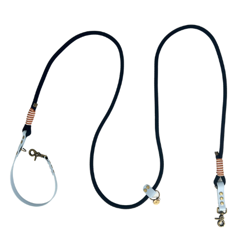 Leaves 3 bi-material points = 3 leashes in 1! -in dog leash position with handle leash: 2.50m -in shoulder strap position: 2.00m - adjustable handle thanks to a sliding loop -in the shortest position for the city: 1.40m Composition: 10 mm diameter paracord, breaking strength 1295kg - number of strings 48 - decorative braiding in fine paracord + BioThane® with a width of 19mm and a thickness of 2.5mm - breaking strength 340kg - breaking strength 340kg - Standard B10 - Standard B10 - Zinc buckles with antique brass finish Kitsunē multi-position dog leash entirely handmade Digital photo: there may be a slight color difference between the visual on the screen and the article