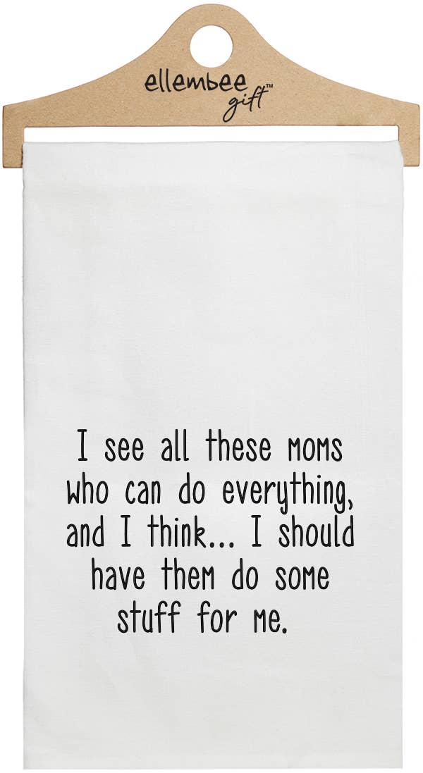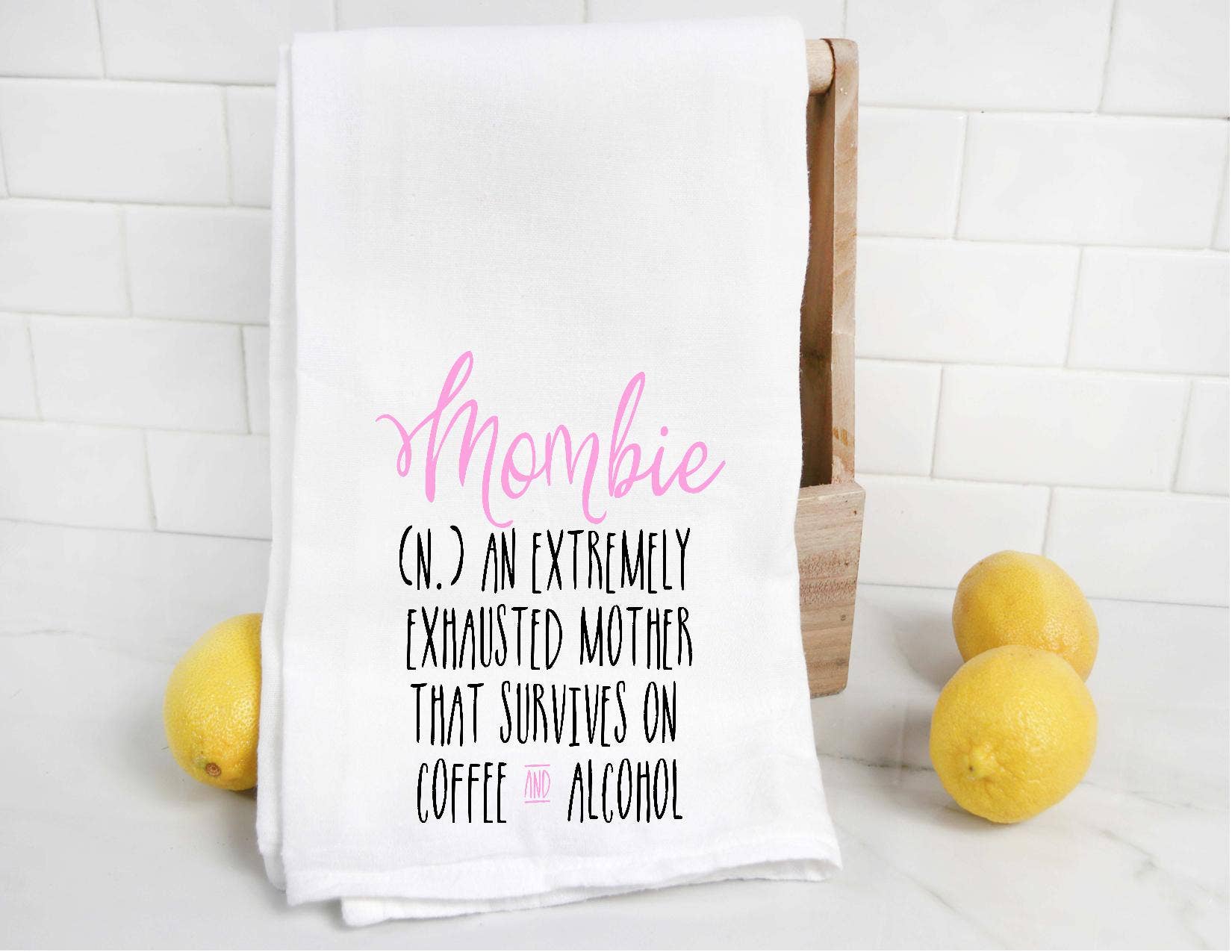 Mombie tea towel. Tea towel is made of absorbent and durable 100% premium cotton. Towel measures approximately 27"x27" with a corner loop for convenient storage or hang drying. The image is put on the towel with a commercial heat press and heat transfer paper Our tea towels make a wonderful way to bring your personality into the room, and you can't help but love them! No two towels are exactly alike.