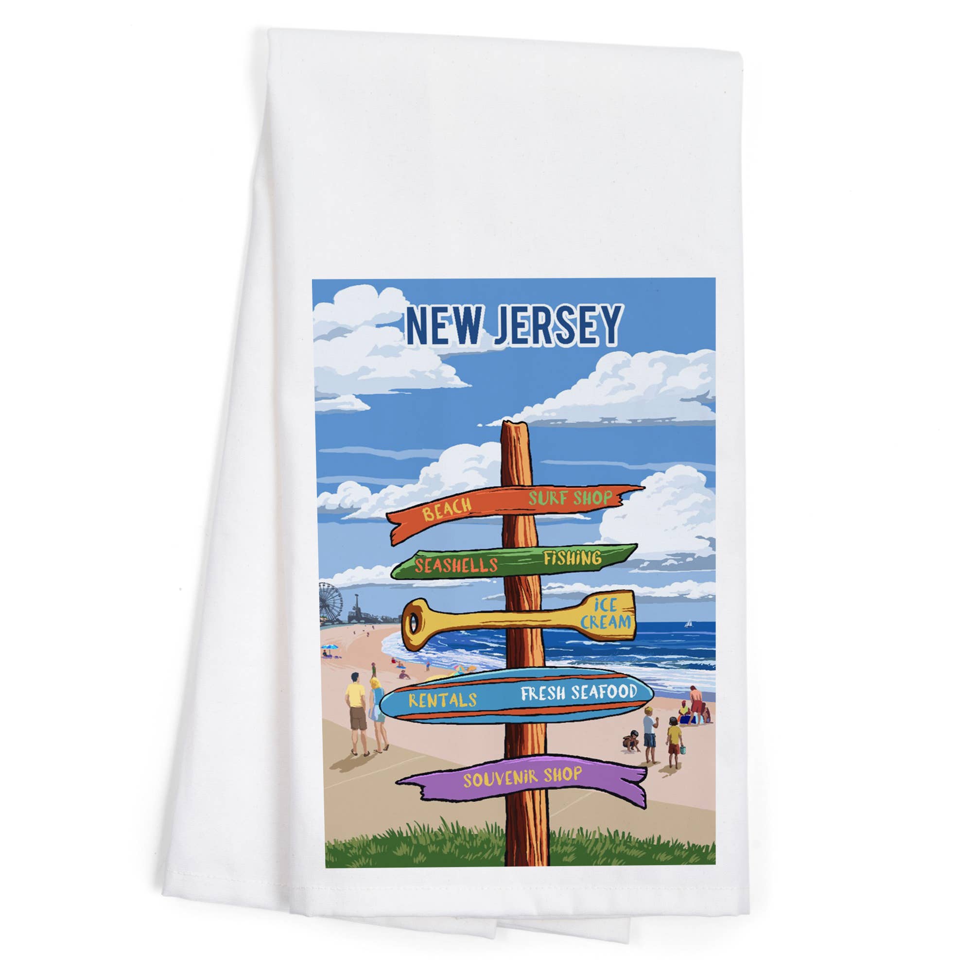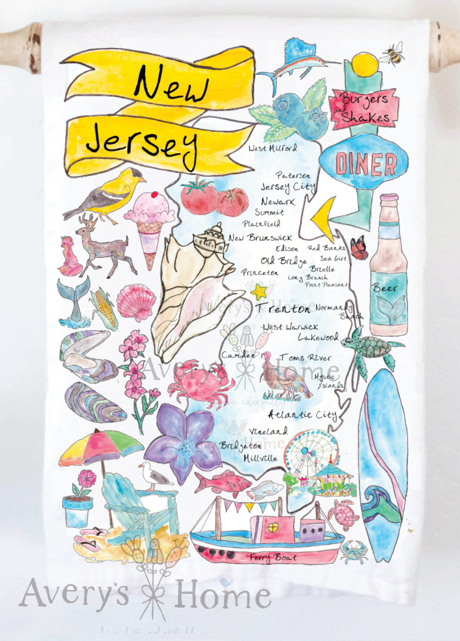 Whimsical depiction of New Jersey on a 18" x 28" cotton Tea Towel. Original Galleyware artwork shows the major towns and attractions. Material: 100% Cotton. Lint-free. Hangs easily with attached loop. Care: Machine wash cold. Tumble dry low or line dry for best results. Safe to iron. Do not use bleach. Do not use fabric softeners which leave an oily, water-resistant layer on the towel, making it harder to absorb moisture. Source: India.