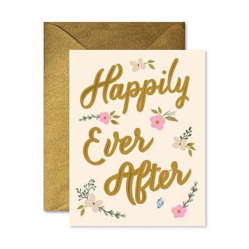 A blush pink background bursts with hand-painted blooms in red, gold, blue, and pink — tulips, peonies, and forget-me-nots tossed loosely across the card with confident brushstrokes and plenty of color. A deep forest green scallop-edged oval sits centered over it all, mixing bold white caps with sweeping script: "AND THEY LIVED happily EVER AFTER." The kind of card that's joyful and a little dramatic in the best way, and works for weddings and celebrations where the couple deserves something that matches the occasion's energy. Front reads "And they lived happily ever after" in mixed type. Size: A2 (4.25x5.5), blank inside. Matching cream envelope. Printed on 100% recycled paper, made with wind power in the USA. Perfect for gift shops, boutiques, bookstores, and garden centers.