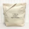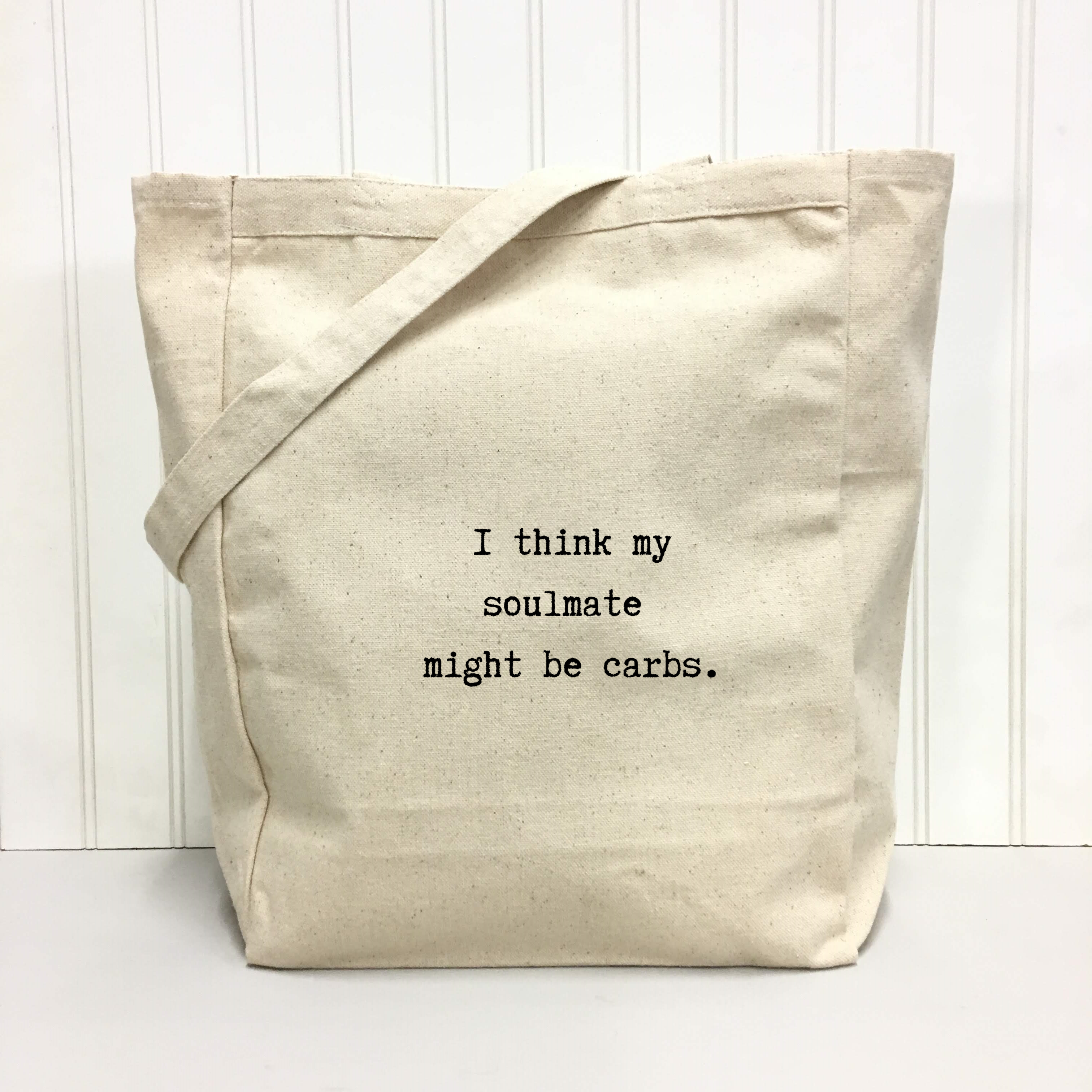 "I think my soulmate might be carbs." 100% cotton tote bag. Size: 14.75x14.75x5 **Customizable** Add your logo to the opposite side of the tote! Include your email address, and we'll let you know how to send us your logo.