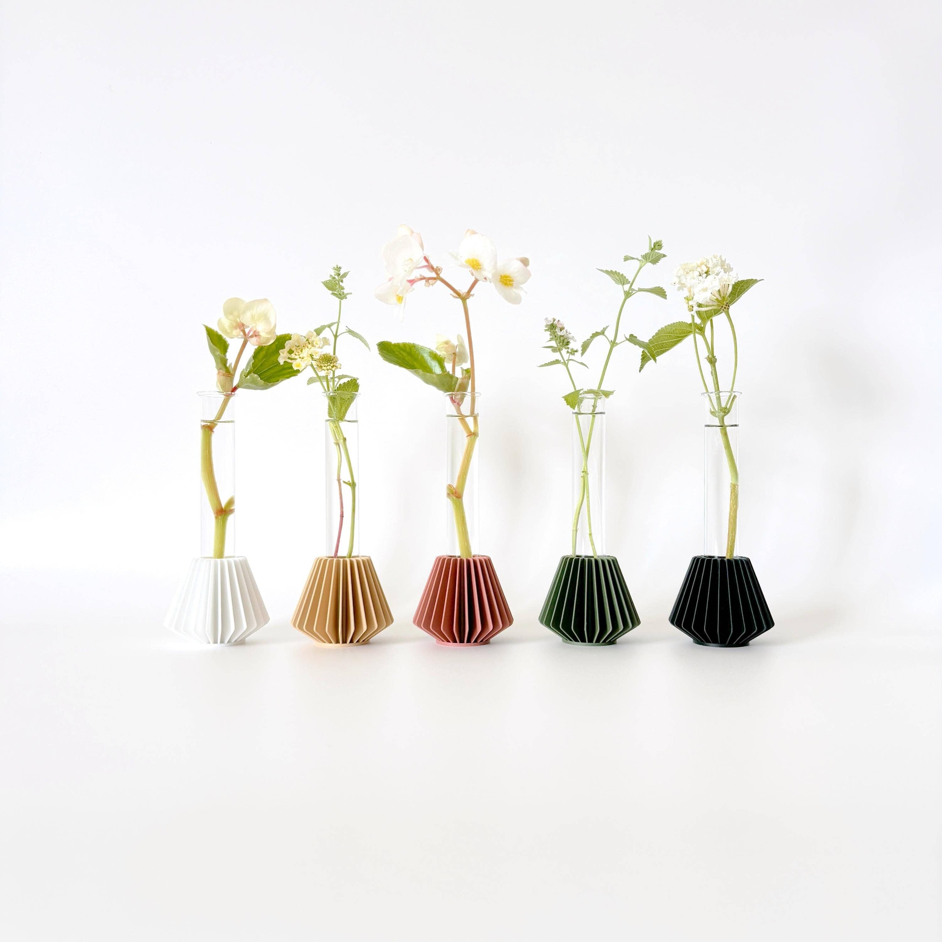 TARIFF-FREE, DUTY-FREE, C.U.S.M.A. Compliant Meet the KANJI (간지) Vase, our Korean style bud vase infused with Scandinavian influences, in a 3D printed form. The vase comes with a removable test tube for effortless cleaning, which makes it it functional and elegant. Elevate your space with this unique centerpiece, whether it is for your home, a gift, or for your next event. Includes ONE KANJI Floral Bud Vase, 3D Printed ONE Glass Test Tube * Plants & florals NOT included. Dimensions Diameter: 6.5 cm Height: 15.5 cm Test Tube 2 cm x 15 cm How to Use Fill your glass tube with water, and rest your baby plant or flowers for maximum cuteness. Dorm room, Renter, and Homeowner friendly! Do not immerse the 3D printed item in water. Wipe with a damp cloth to clean surface. Care Guide Do not immerse the 3D printed item in water. Wipe with a damp cloth to clean surface.