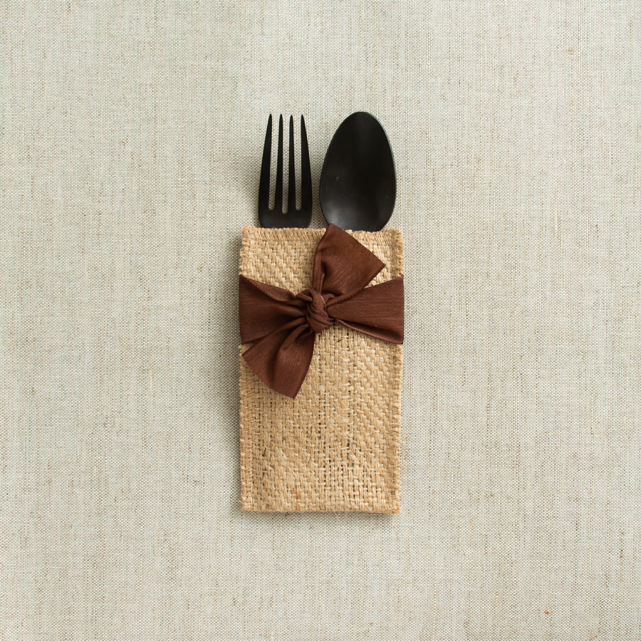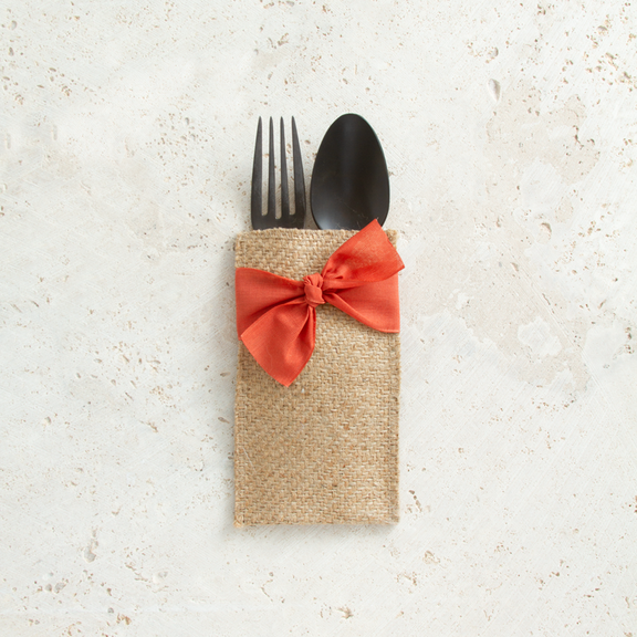Our hand-tied ribbon silverware pouch adds festivity to any table decor. We love this style because it goes with just about everything. Perfect when you're dining alfresco or when you want to bring the outside in. Set includes 8 woven jute pouches wrapped with a hand-tied ribbon. Packaged in a muslin, reusable storage bag. Size: 6" x 3 1/4". cloth napkin, cotton napkin, napkins, cutlery couture, silverware, home decor, gifts, spring, beach, garden 4th of July, Mother's Day