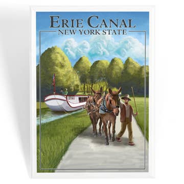 2" x 3” wrapped metal magnet. To order more than 19, you must choose "19+" from the quantity drop-down, and then edit the number for the quantity you desire. The Erie Canal is a canal in New York that ran 363 miles (584 km) from where Albany meets the Hudson River to where Buffalo meets Lake Erie. It was built to create a navigable water route from New York City and the Atlantic Ocean to the Great Lakes. When completed in 1825, it was the second longest canal in the world (after the Grand Canal in China) and greatly affected the development and economy of New York, New York City, and the United States. Original artwork by Catherine LaPointe Vollmer.