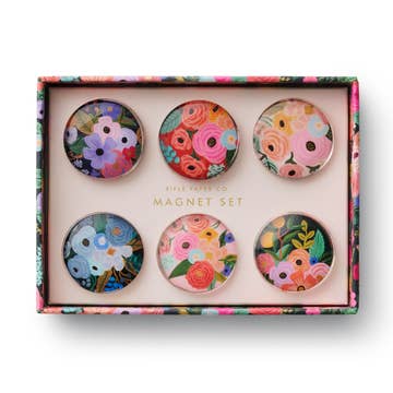 HANDCRAFTED IN MY NEW YORK STATE STUDIO, USA. 25 MM (1") ROUND GLASS MAGNETS FEATURING DETAILS FROM MY ORIGINAL FLORAL ILLUSTRATIONS IN MULTIPLE COLORS, THAT EVOKE BEAUTY AND A SENSE OF ROMANCE. STRONG ADHESIVE ROUND 3M MAGNET ON BACKS. 7 MAGNETS TO A PACK, ADHERED TO CREAM-COLORED, HEAVY CARD STOCK WITH A HANDCRAFTED SCALLOPED EDGE. THE CENTER MAGENTA MAGNET IS A CONSTANT COMPONENT, BUT THE COLORS OF THE OTHER 6 MAGNETS IN THE PACK MAY VARY (I TRY TO CREATE VISUALLY CONSISTENT SETS OF 7). MAGNETS ARE PACKAGED IN AN ARCHIVAL, ACID-FREE CELLOPHANE POUCH.