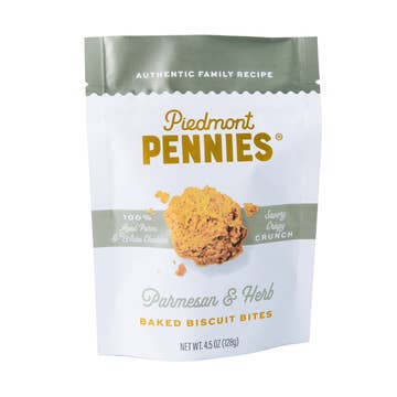 Bite into the bold, cheesy goodness of Piedmont Pennies Cheese Crackers, a modern twist on the classic Southern cheese straw. Made in small batches with real sharp cheddar and a perfectly buttery crunch, these addictive little rounds come from a woman-owned company proudly based in North Carolina. Whether you’re building a charcuterie board, setting out a bar mix for cocktail hour, or searching for the perfect holiday snack, Piedmont Pennies deliver flavor that pairs effortlessly with wine, craft beer, or your favorite cocktails. They’re equally at home as bar cart essentials, slipped into stocking stuffers, or wrapped up as thoughtful hostess gifts. Why our customers love them: - Authentic cheesy flavor baked into every bite. - The perfect crunchy cracker for snacking or entertaining. - Made in North Carolina by a woman-owned business. - Ideal for gifting, parties, and everyday treats. - A Southern tradition reimagined for modern snack lovers. Bring home Piedmont Pennies Cheese Crackers and enjoy the taste of real cheddar baked into the ultimate savory treat. Perfect for sharing—or not! Product Details: - Parmesan & Herb Flavor - 1.7 oz each, 25 units per case - $2.30 wholesale, $3.99 retail - Resealable personal snack size - 1 year shelf life Brides love this size for wedding welcome bags, hotel bags, welcome gifts, party favors. Mom's love it for on-the-go road trip snack or teacher gift. Hosts love them for a gourmet treat to keep on hand for a quick charcuterie board or spur of the moment cocktail hour.