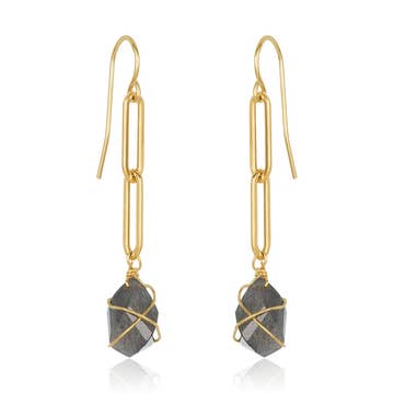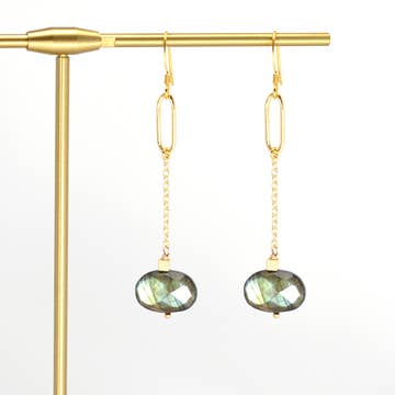 These fashion forward earrings are the perfect accessory for your favorite stylish outfits. A beaded oxidized bar drops a geometric cut labradorite gemstone, creating long lines that make a statement.