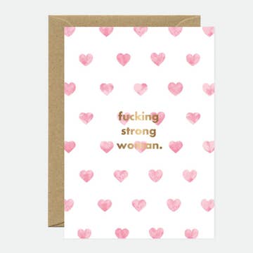 "Strong Woman" card featuring bold red text on a soft pink background with an empowering message. This feminist card is perfect for sending encouragement and celebrating any (every!) woman who needs it. Our greeting cards are: