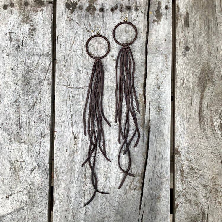 Embrace your inner Freebooter with these leather and feather earrings. Supple deerskin leather, coque feathers, and antique-brass chains brush the chest at 10" total length. Finished with brass earhooks. Available in 7 colors. Earhooks are antique-brass. Goldfill earhooks available by request. All feathers are sustainably sourced in the USA.