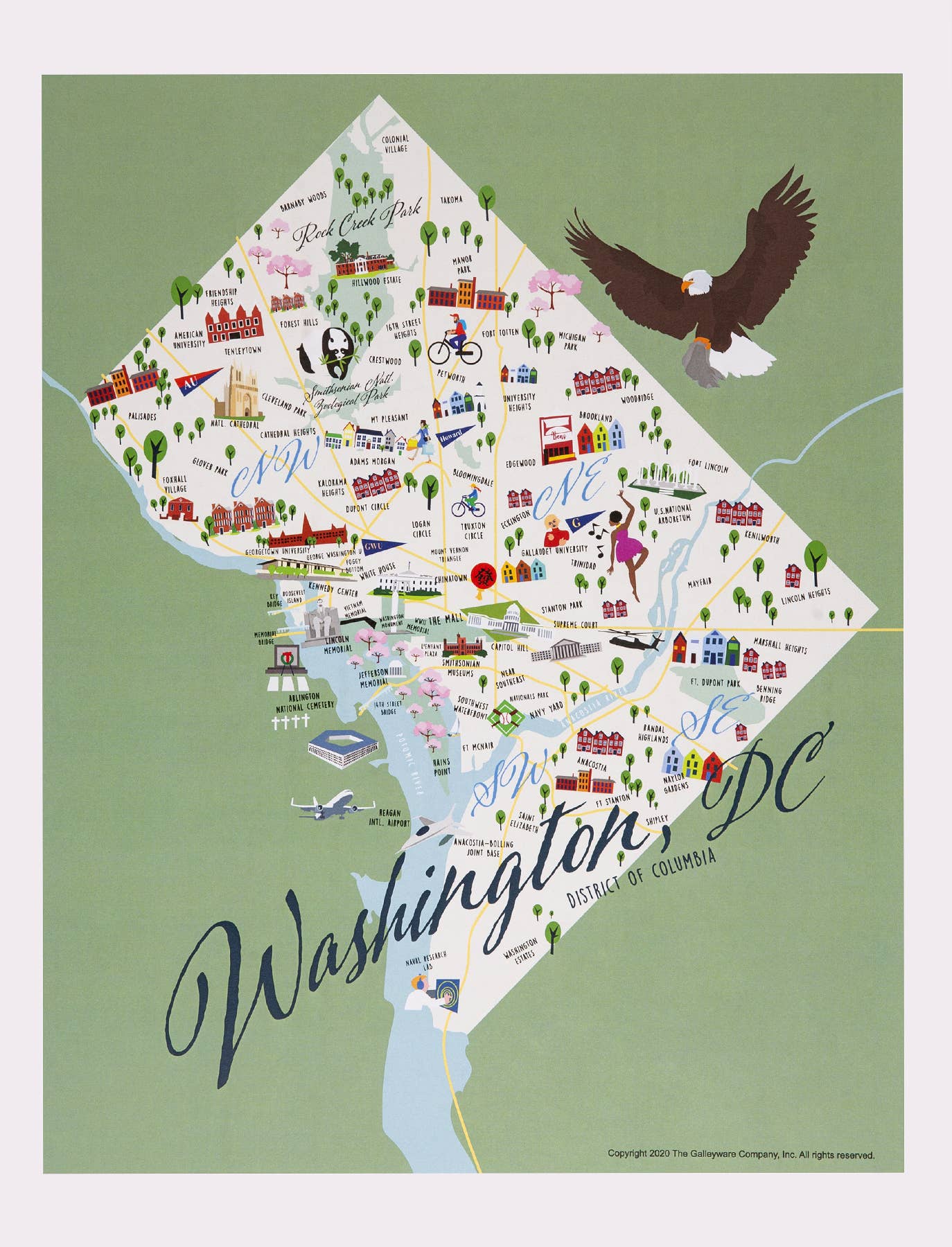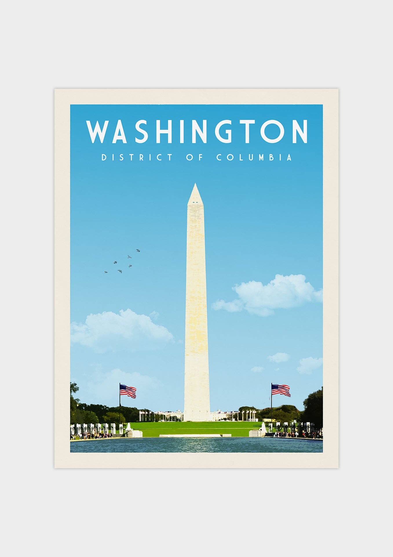 This high-quality Washington DC print measures 11 x 14 inches. The frame is not included. There is no need for custom framing. Premade frames are easy to find for this standard size. The print ships sealed in a clear cello bag along with a sturdy backer board. This design is also available as a magnet and greeting card. Made in the USA.
