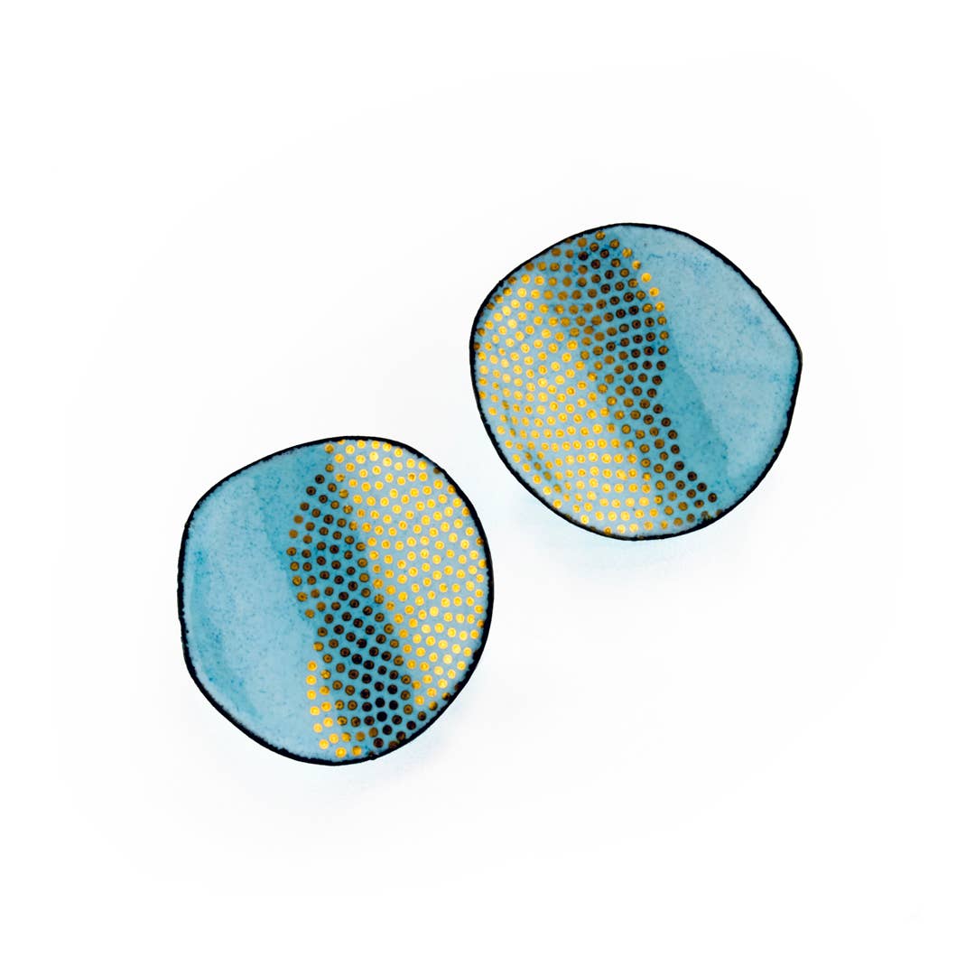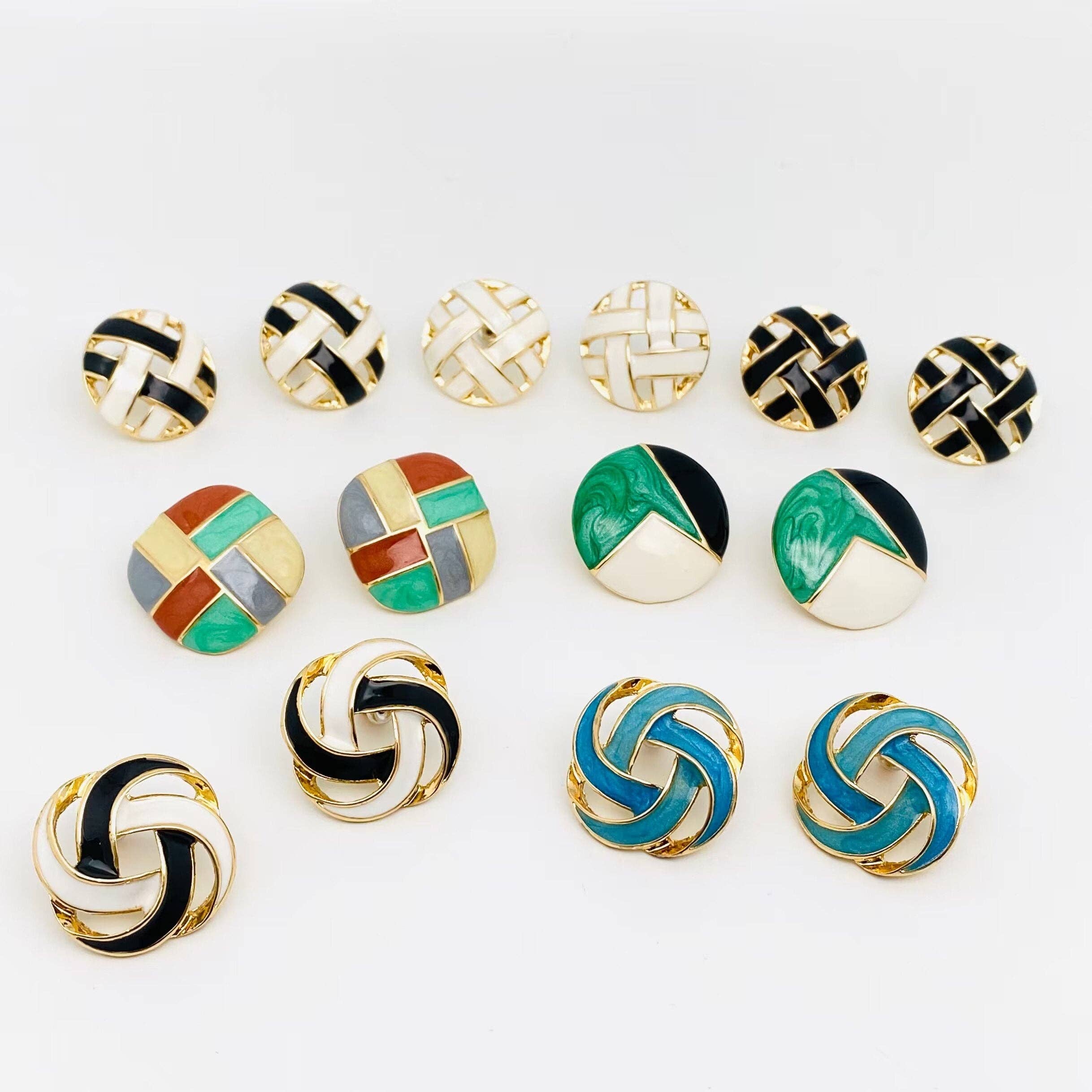 Blue, green, and black modern geometric patterned fabric button earrings. All earrings are made with hypo-allergenic, nickel-free titanium posts.