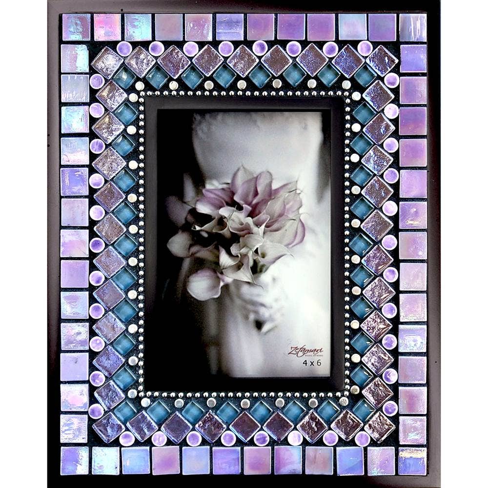 Glass tile and beads are embedded into a beautiful black frame to create a unique and finely crafted picture frame. Scratch- and chip-resistant finish. Holds a 4"x6" or 5"x7" picture (8"x10" or 9"x11" overall dim). Includes self-leveling hanger and fold-out stand.