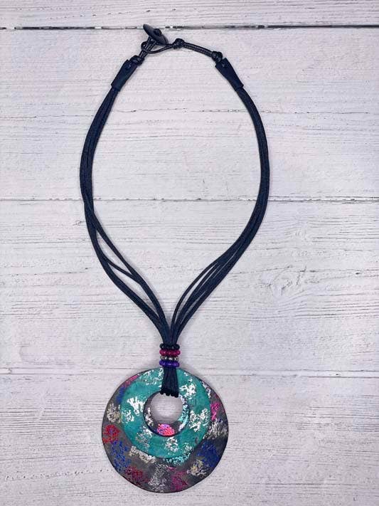 Layers of coordinating patterns stacked together in a lovely oval pendant. 16 - 19" adjustable. Nickel free silver plate. lobster clasp.