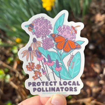 This sticker reads "I Love Native Plants" and features flowers native to the Mid-Atlantic and Northeastern United States- Common Milkweed, Red Columbine, Great Blue Lobelia, New England Aster, Blue Phlox, Purple Coneflower, and Cardinal Flower. The sticker is made of a durable vinyl, laminated to protect against scratches, rain, and sun. It measures 4" inches, has a matte finish and a white border. It can be used on water bottles, laptops, cars, planners, mailboxes, etc. This item is loose with no packaging.