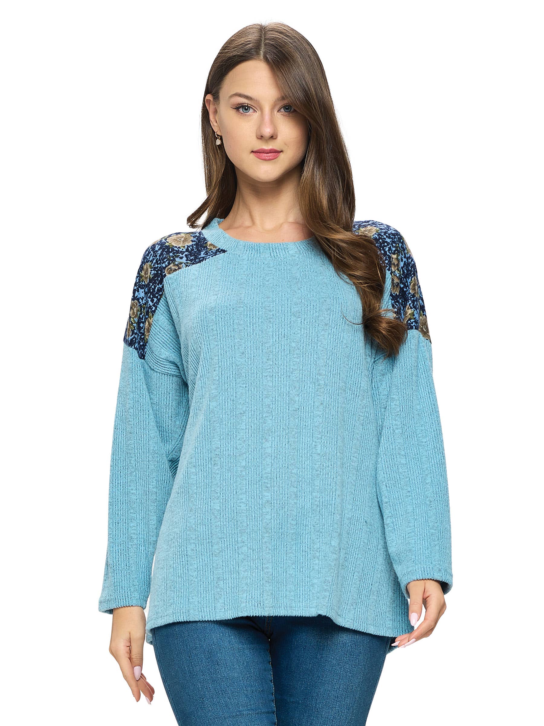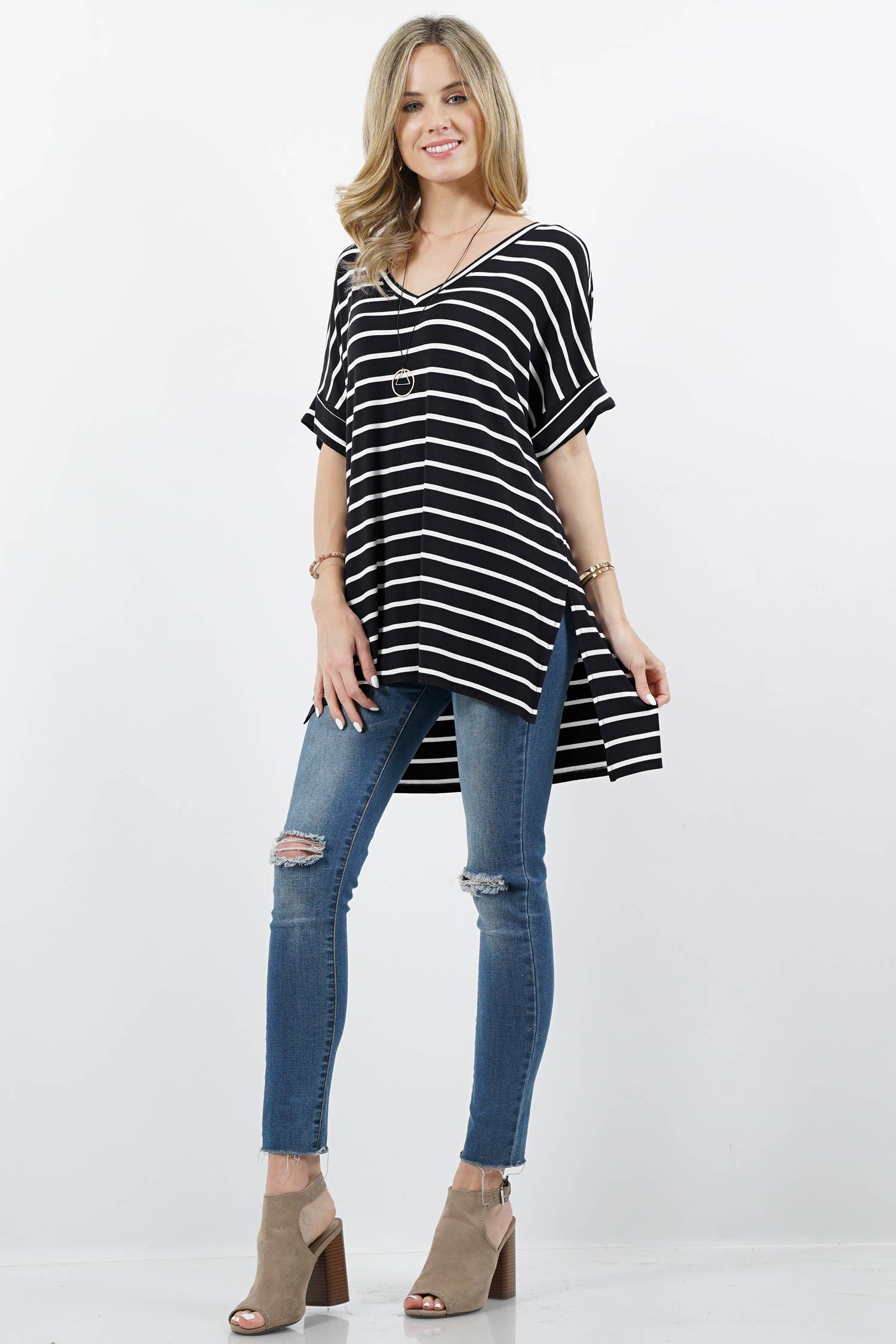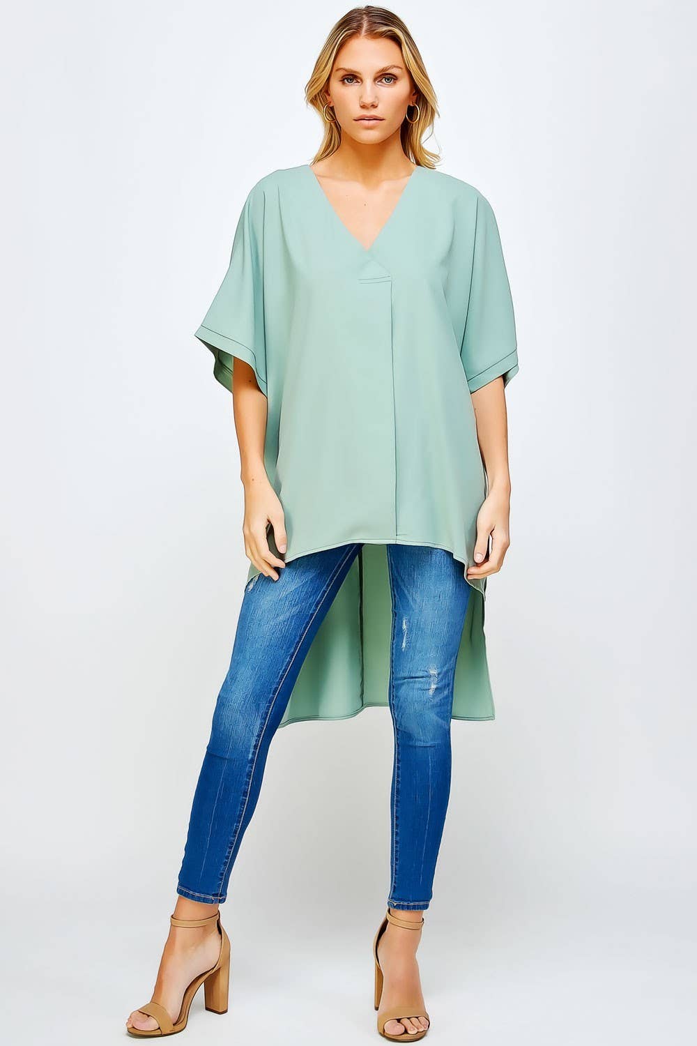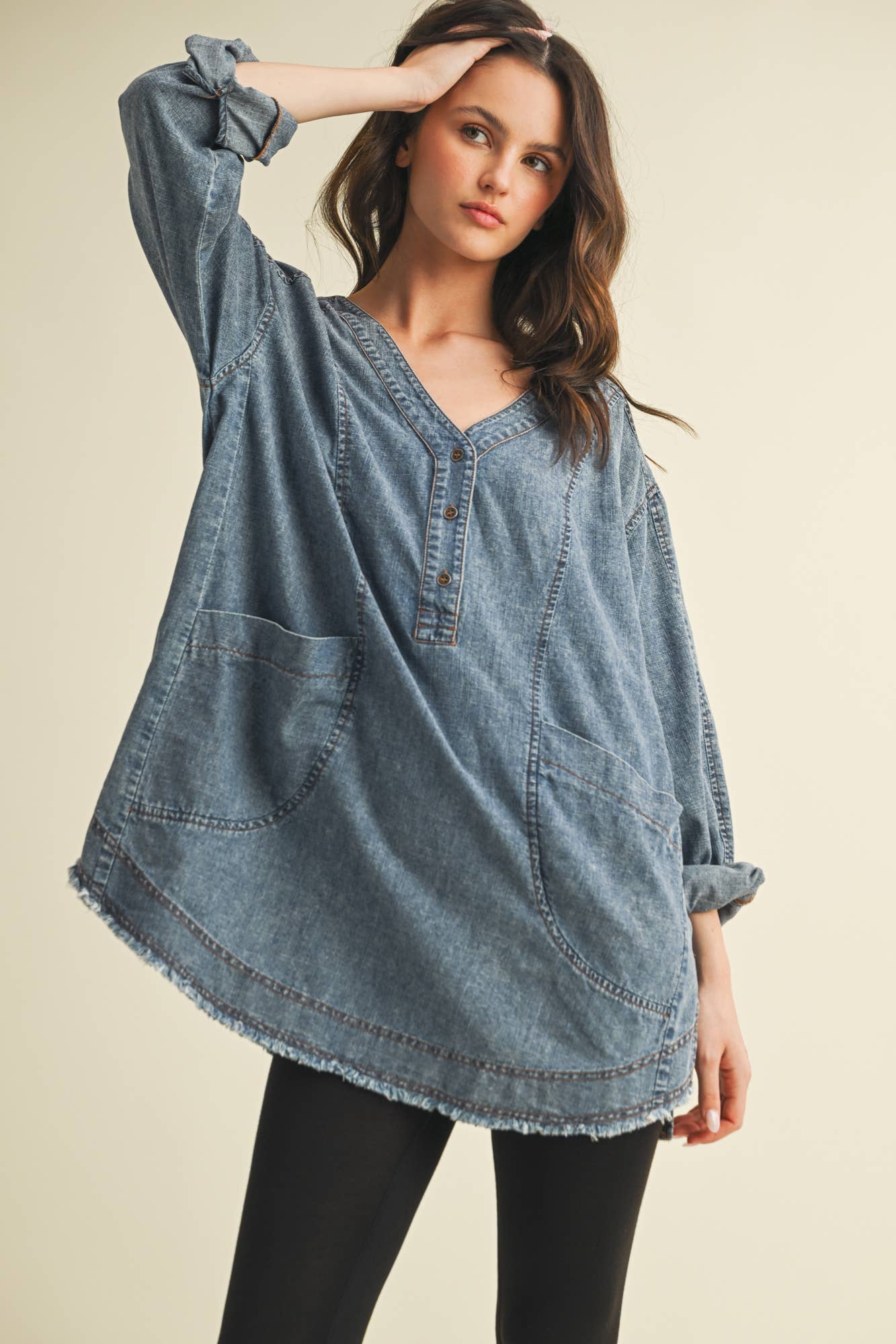 -Relaxed ovesize babydoll top -Medium denim color wash -Short sleeve with roll up cuff binding -Boat neck with stich detail -Button hole back closure -Front chest pocket -Frayed hem with side slit detail -Imported Handwash 100% Cotton Model is 5'8" and wearing a size Small.