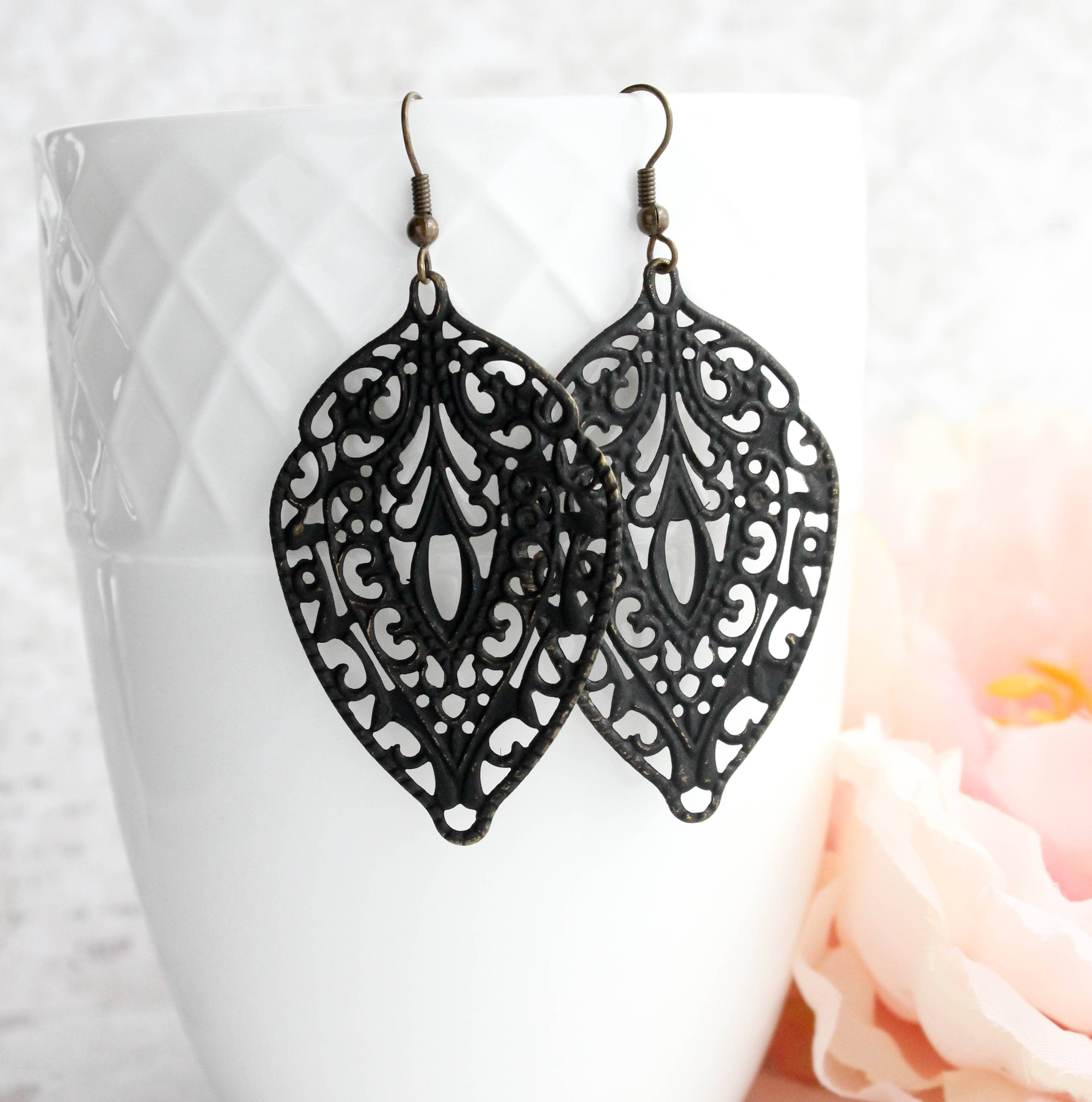 These are gorgeous peacock feather filigree earrings in matte gold or matte silver rhodium! The unique modern design has intricate details. These would be beautiful for everyday or would be lovely accessories for a bridal party! Feminine, romantic and modern earrings that will soon become your favorite go-to accessories! Details: ~The gold filigree drop measures approx 1.75"l (45mm) ~Total earring length is approx. 2.25" long ~These modern boho earrings are gold or silver plated and have nickel free fish hook ear wires.