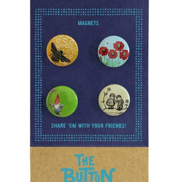 Set of garden gnome and bumble bee magnets - 1.25" round - Two button magnets - Packaged on a recycled kraft backing card in a hanging cellophane bag - Made in the USA
