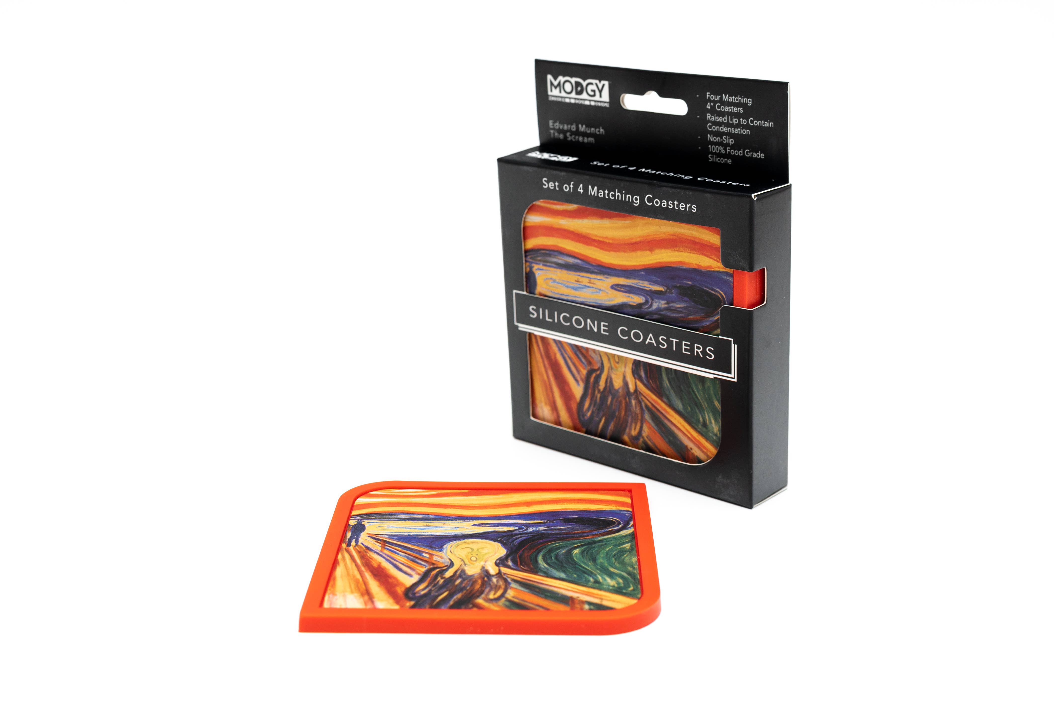 Each set of Modgy Silicone Coasters is made with food grade silicone and are 4” x 4” in size. Each set is packed 4 (Four) of a design in a decorative retail box. Perfect for both hot and cold drinks. Our Silicone Coasters have a raised lip to contain moisture and a non-slip bottom. Weight: 6.5 oz. Materials: 100% Silicone. Care: dishwasher safe, or hand clean with warm soapy water.